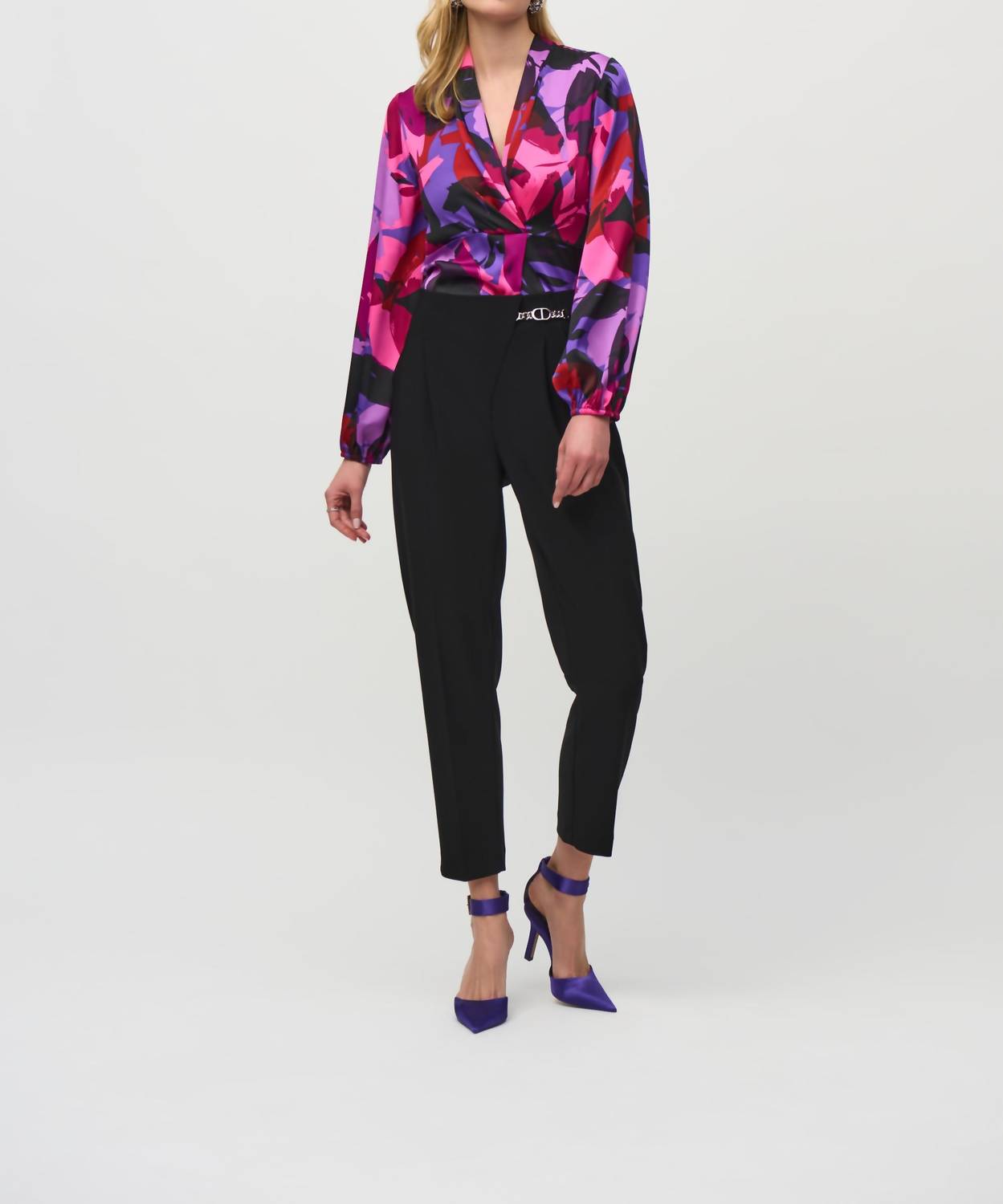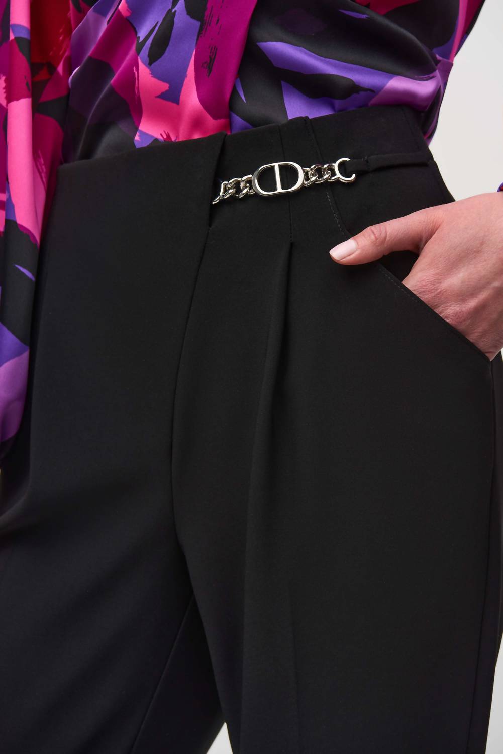 A straightleg pant that workes season after season. Dress these up with your favorite blouse or keep it casual with your go-to tee. Introducing the Black Silky Knit Crop Pull-on Pants by Joseph Ribkoff, designed for the modern business minimalist. These high-rise, ankle-length trousers boast a slim fit with a straightforward solid pattern, ideal for formal or office settings. Made from a blend of 96% Polyester and 4% Spandex, they feature a comfortable elastic waistband and a leg style that epitomizes straight elegance. Made in Canada, these versatile pants are easy to care for with hand wash and line dry instructions. The inseam for size 12 measures approximately 29 inches (74 cm).