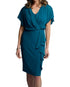 Make a statement at any cocktail party. Stunning mini dress in Lagoon Blue. Features short sleeves and a fashionable wrap silhouette with side ruffles. Expertly crafted from 95% polyester and 5% spandex. Promises both comfort and style. Closure is achieved through a discreet zip. To be dry cleaned only.