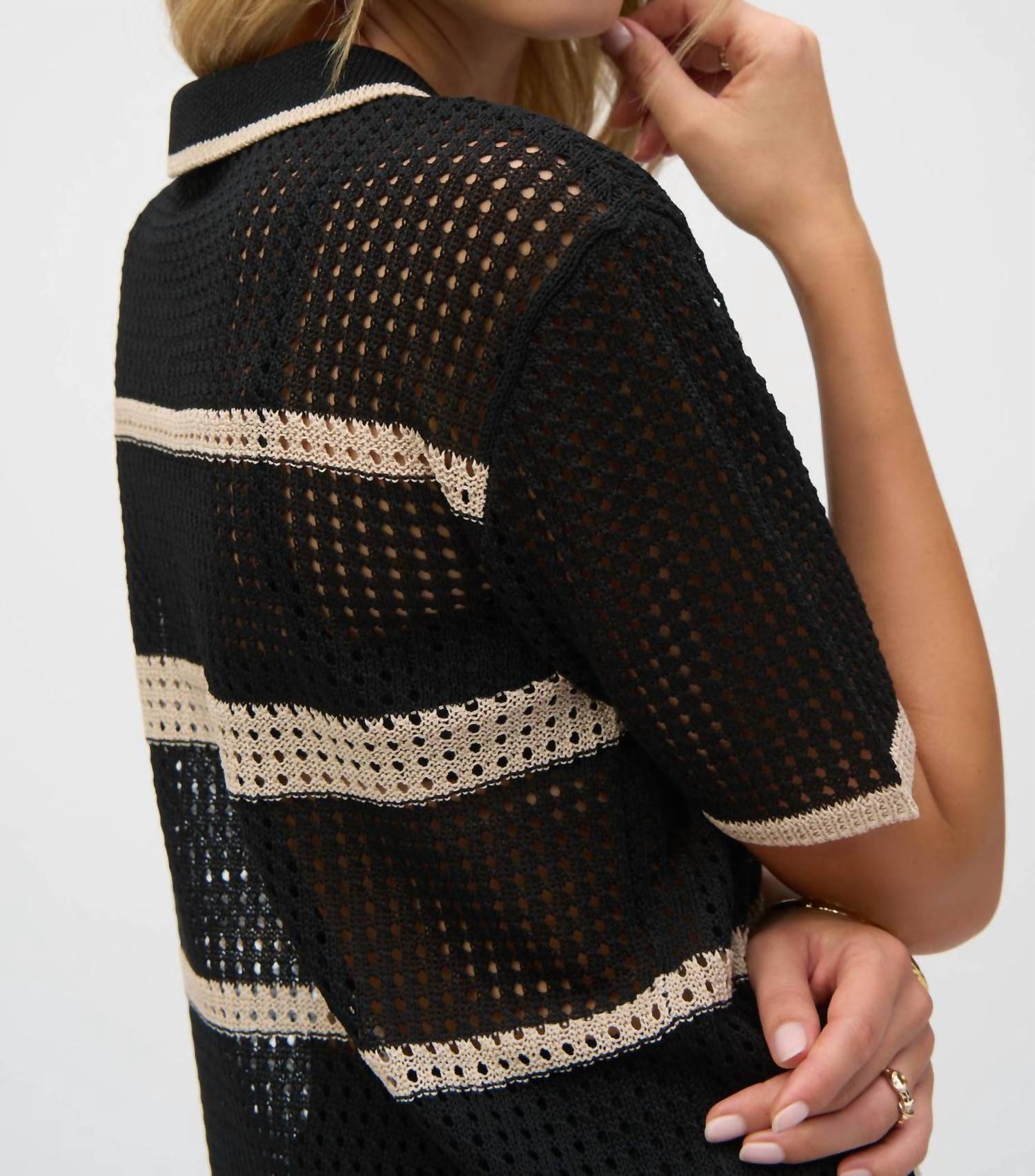 Embrace effortless style with the Women's Knit Open Stitch Stripe Sweater by Joseph Ribkoff, crafted from viscose for a luxurious touch. This textured short sleeve cardigan features a chic V-neckline, perfect for a vacation or streetwear look. Designed in classic black, the sweater is complemented by a convenient button closure. Ideal for summer wear, this piece adds versatility to your wardrobe.