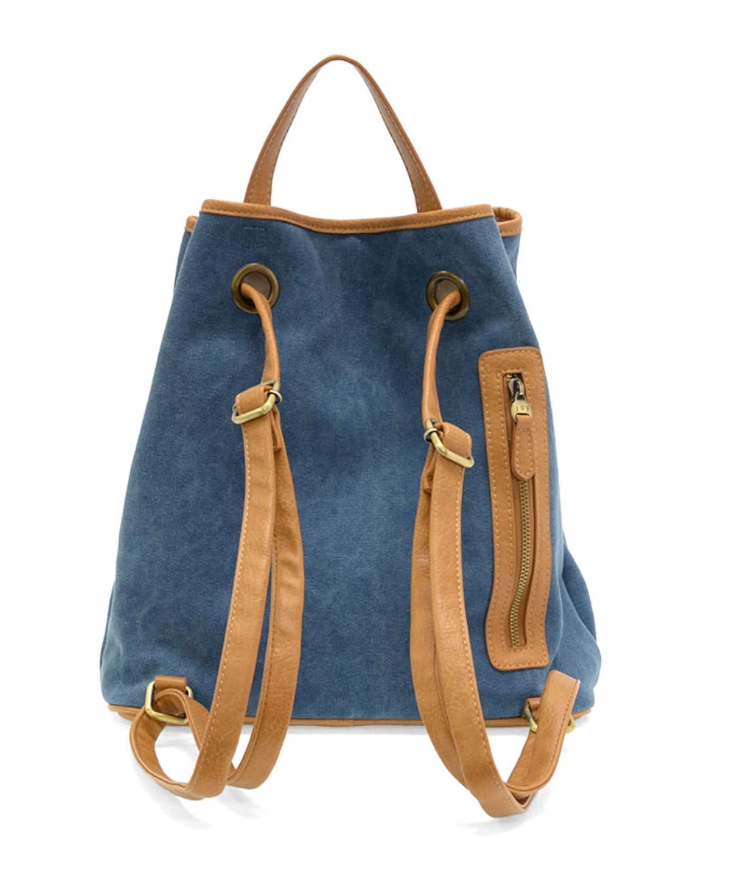 The perfect size backpack that fits everything you need! Introducing the Women's Memphis Canvas Backpack by Joy Susan, a stylish and sustainable choice for your everyday adventures. This denim-colored backpack is crafted from durable canvas with 100% vegan leather trim, featuring a draw closure and brass-plated hardware for a chic finish. With dimensions of 13 inches in height, 12 inches in width, and 5 inches in depth, it offers a spacious interior with a zip pocket, along with exterior front and back zip pockets for convenient storage. Adjustable shoulder straps and a 3-inch drop top handle ensure comfortable carrying, making it a perfect blend of fashion and functionality.