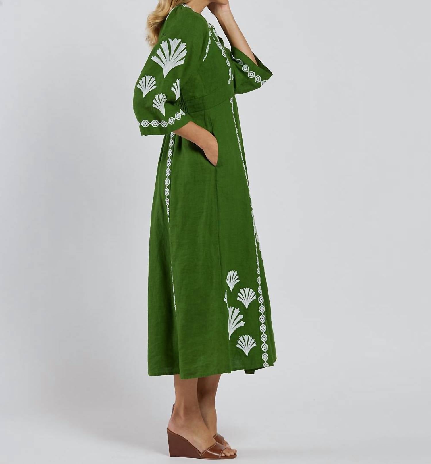 Style this maxi with your favorite statement necklace and sandals for the perfect look. Introducing the Clementine Caftan Maxi Dress by Jude Connally, an effortlessly elegant choice in Garden Green White ideal for both casual gatherings and elevated occasions. This kaftan silhouette dress features elbow sleeves and a flattering V-neckline, crafted from a breathable cotton-linen blend. With intricate detail work and the convenience of pockets, it stands at 48 1/4" from the top of the center back in a size small. Closure: Pull-on style. Care: Machine wash cold, tumble dry low or line dry.
