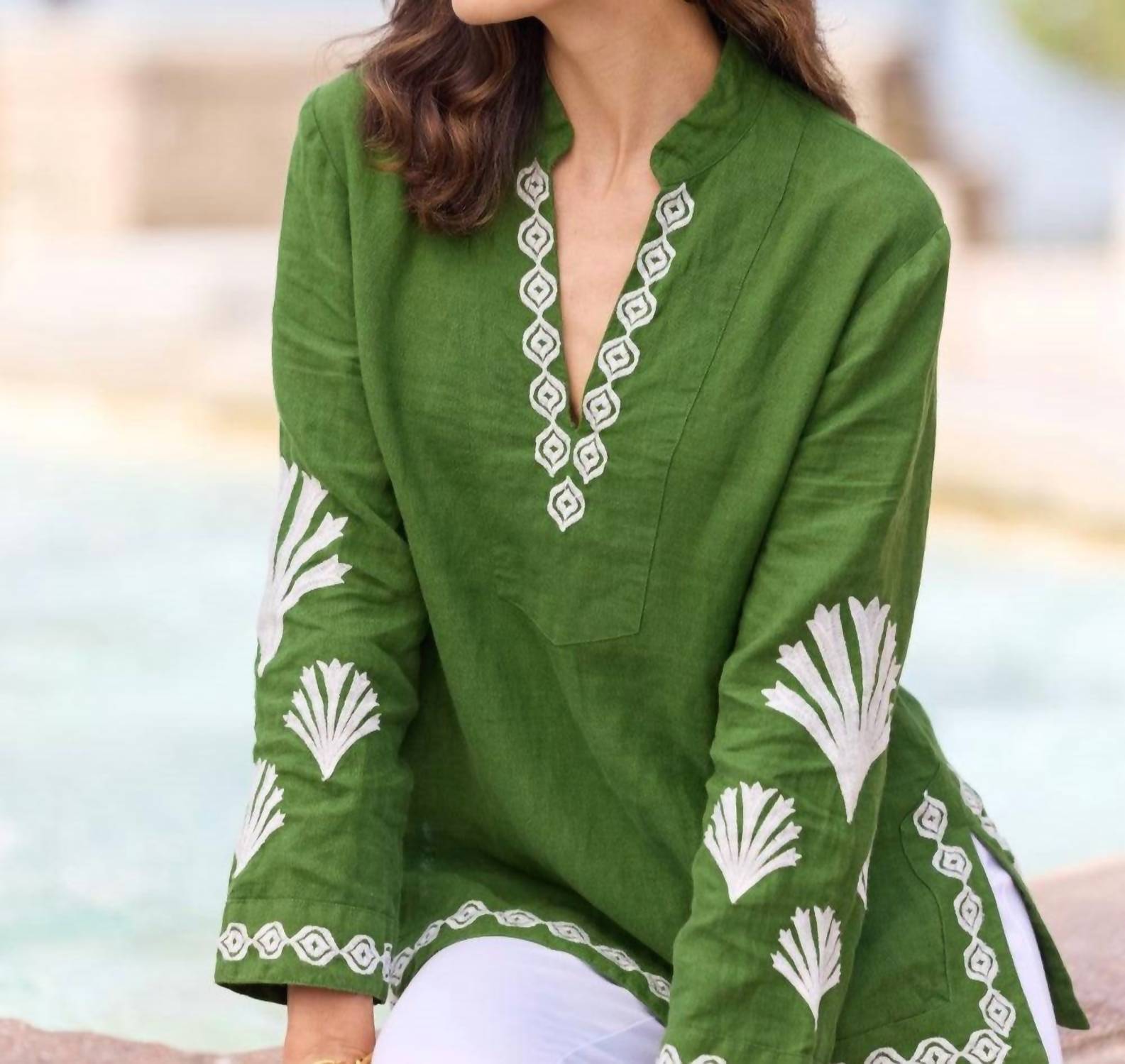 Introducing the Elyce Tunic Top by Jude Connally, a beautifully crafted piece featuring long sleeves and a flattering V-neckline. Made from breathable linen, this tunic is not only chic but also comfortable, making it a perfect choice for any occasion. Measuring 26 5/8" from the top of the center back in a size small, it is made in India with exquisite detailing. Closure: Pull-on. Care: Machine wash cold, do not bleach, tumble dry low, can be dry cleaned.