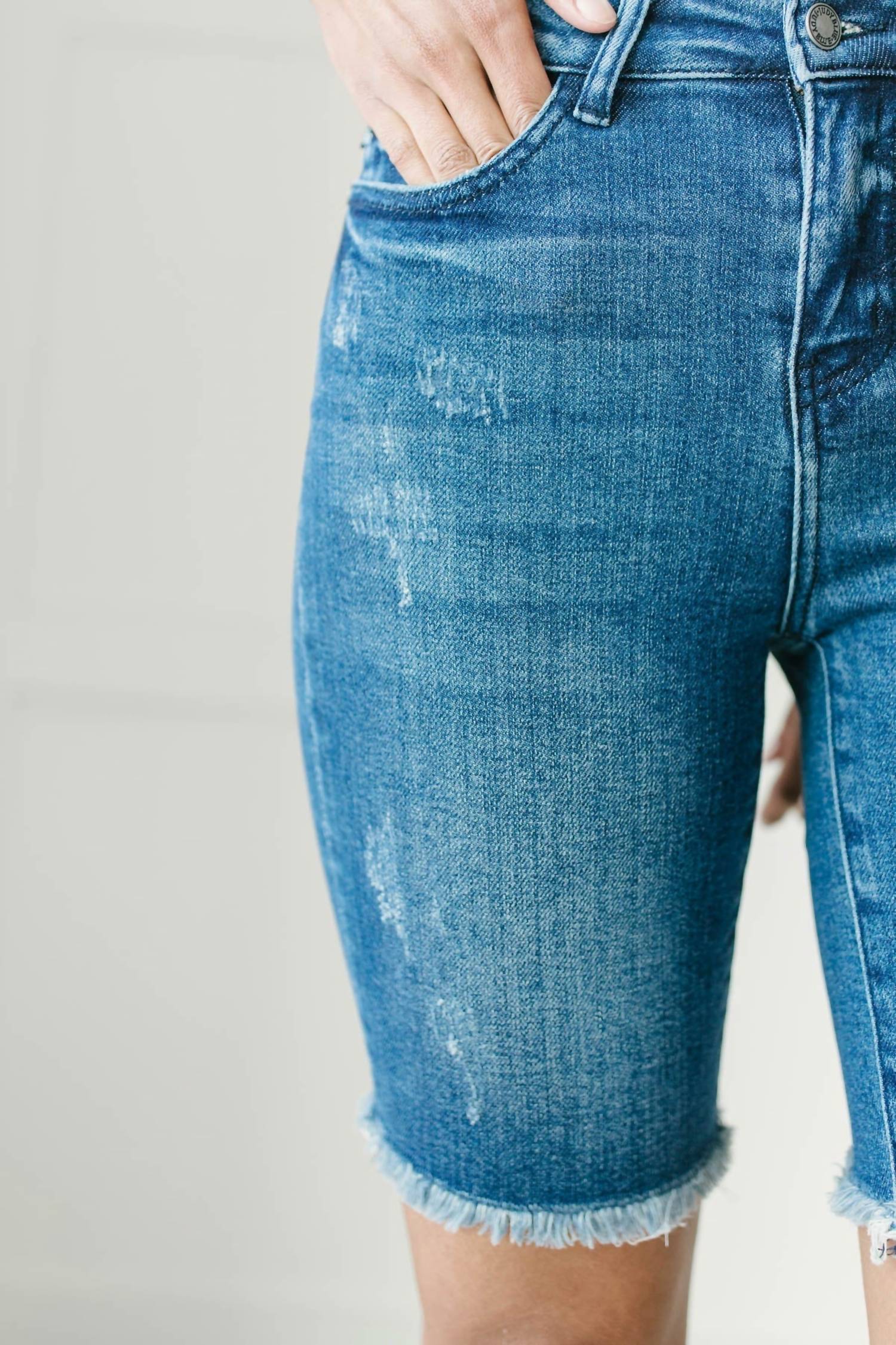 A preppy and feminine take on the classic bermuda short. Comfortable enough to lounge in and cute enough to wear out during your next warm weather outing. High Waisted. Slight Distressing Details. Frayed Hem. 94% Cotton, 5% Polyester, 1% Spandex. Wash Cold, Hang Dry. Fits True To Size.