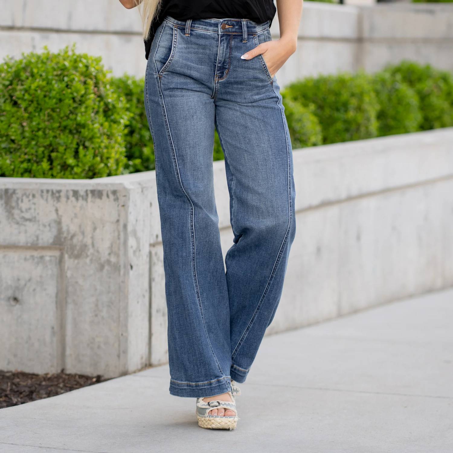 Just as cute as they are comfortable. Judy Blue brings the perfect mix of structure and stretch with these trouser-style jeans. Designed with a flattering high rise and wide-leg silhouette, they offer a polished look that’s effortlessly comfortable. The classic stitching and zipper fly keep things timeless, while the soft, flexible fabric moves with you for all-day wear. Made from a blend of 93% cotton, 6% polyester, and 1% spandex, these jeans are perfect for workdays, weekends, and everything in between.