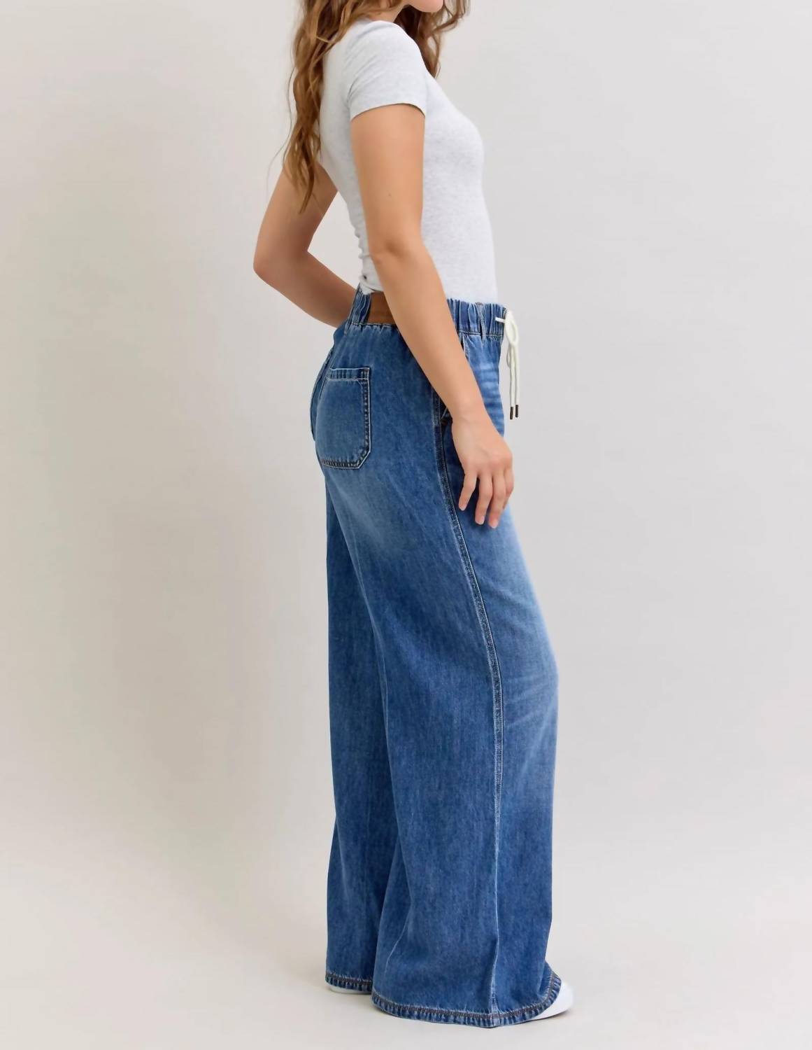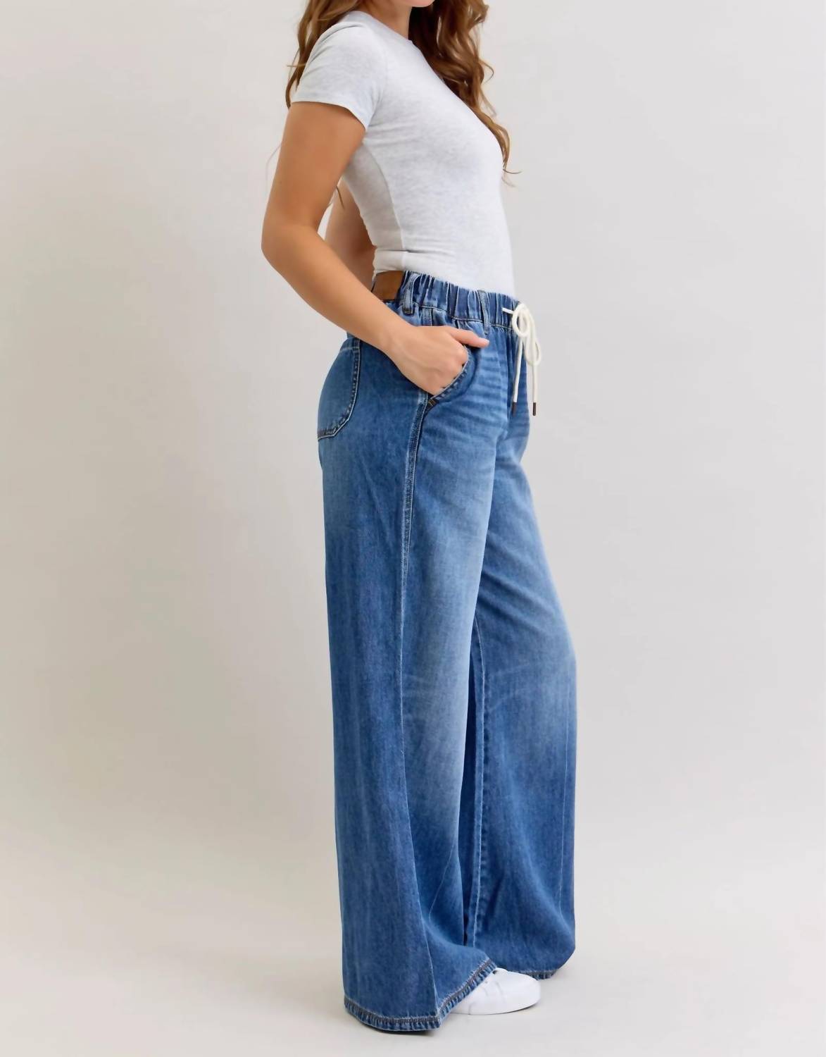 Fit to perfection, we love these high-waist jeans and you will too. Discover the Judy Blue High Waist Featherweight Palazzo Jeans in a classic blue, designed for women who value comfort and style. Made from breathable denim, these jeans feature a high-rise with an elastic waistband and a palazzo cut for a relaxed yet sophisticated look. The pull-on closure ensures ease of wear, while the wide-leg profile complements various occasions, from casual outings to dinner parties. Care for your jeans with simple machine washing and tumble drying, making them a practical and stylish addition to your wardrobe. Available in both regular and plus sizes, with an inseam of 31 inches and a rise of 11.75 inches.