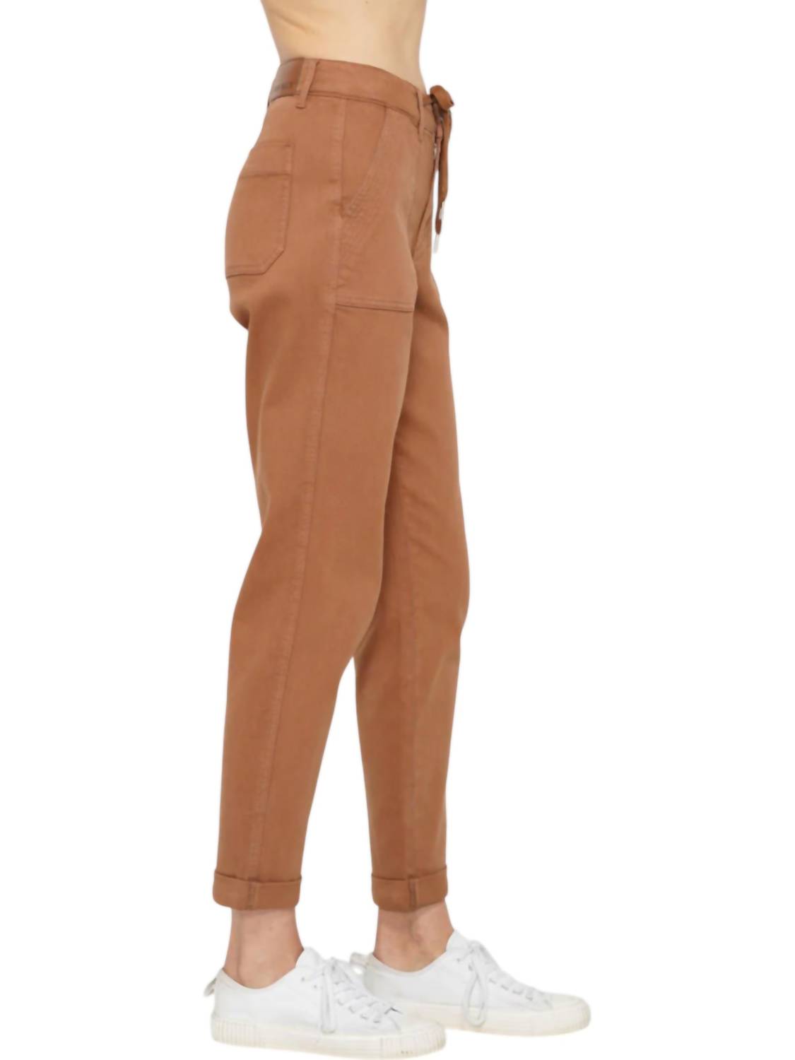 The perfect pant for running around town and looking cool while doing it. High-Waisted Design. Relaxed Fit with Cuffed Hem. Garment Dyed for a Unique, Lived-In Look. Adjustable Drawstring Waist for a Secure Fit. 93% Cotton, 6% Polyester, 1% Spandex. Machine Washable.