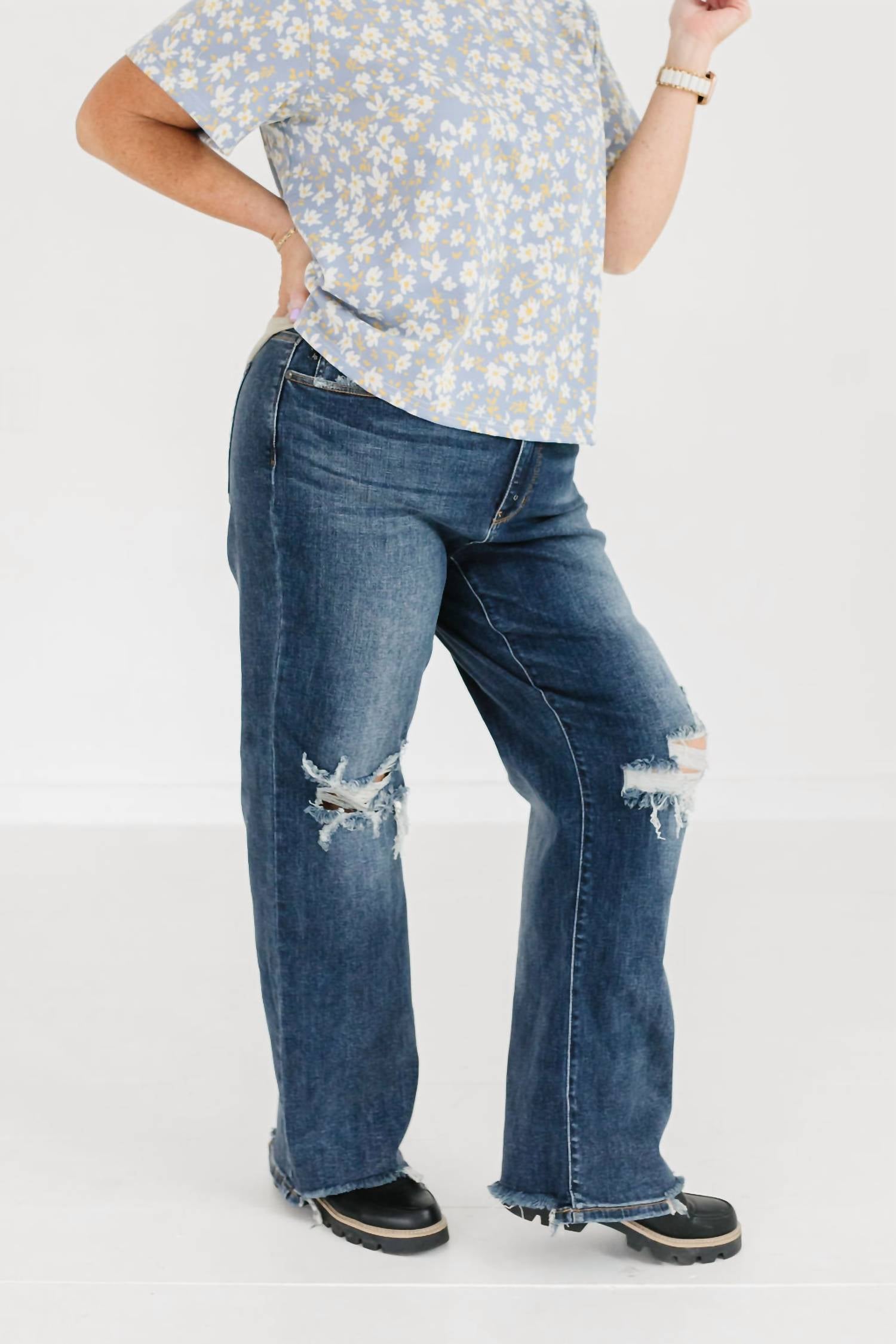 Pair these straight leg jeans with flats, sandals or even heels! You can't go wrong. Elevate your style with the Judy Blue Revere Beach Destroyed Hem Jeans in a dark wash, designed for women who appreciate a bold and edgy look. These high-waisted jeans boast a straight leg and a distinctive destroyed hem, complemented by strategically placed knee holes for added attitude. Crafted from a cotton blend (93% Cotton, 6% Polyester, 1% Spandex), they feature a zip closure and convenient pockets. With a 31-inch inseam, machine wash cold inside out, tumble dry low, and low iron for easy care, these jeans are a wardrobe must-have.