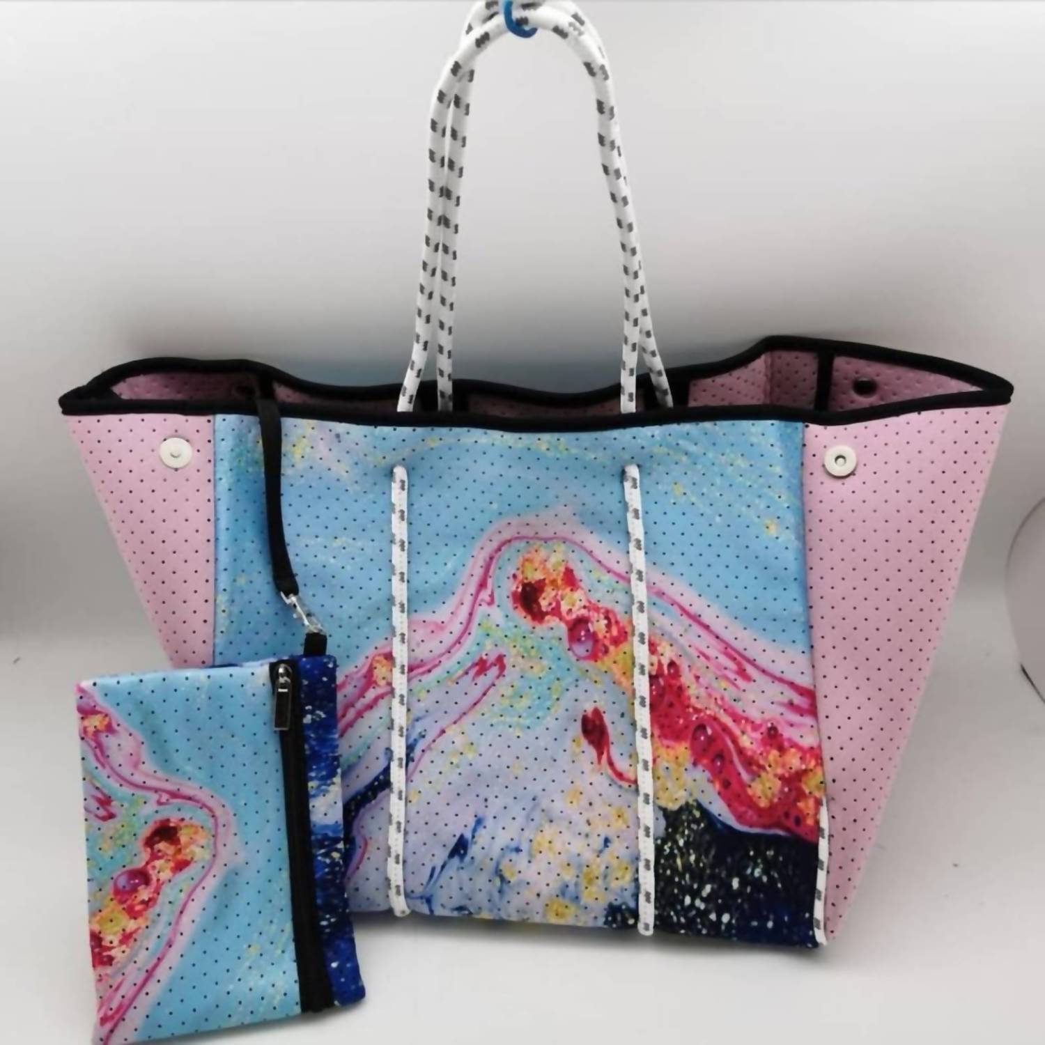 Aside from being the cutest bag ever, this tote is the perfect size to hold all of your vacation necessities. Pair this adorable bag with a flowing dress and some slides and you're all set! Chic tote bag in a captivating pink and blue geode print. Features a lined interior in pink and offers versatile functionality with snaps on the top and sides. Includes zippered pockets on each side and a small attached bag for extra storage. Dimensions: L 23" x H 12.5" x D 9.5". Small zippered bag measuring L 8" x H 6".