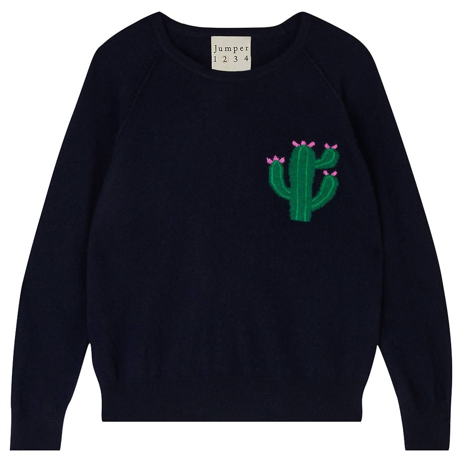 Experience the perfect blend of comfort and style with this trendy crew neck sweater, designed to effortlessly elevate your wardrobe. Pair it with your favorite denim and loafers for the perfect look. The Cashmere Cactus Sweater by Jumper1234 combines playful design with luxurious comfort. Crafted entirely from cashmere, this navy crewneck jumper features a charming embroidered cactus and a flattering slim fit. Sleeve Length: Three-quarter sleeve. Closure: Pull on. Care: Hand wash and lay flat to dry.