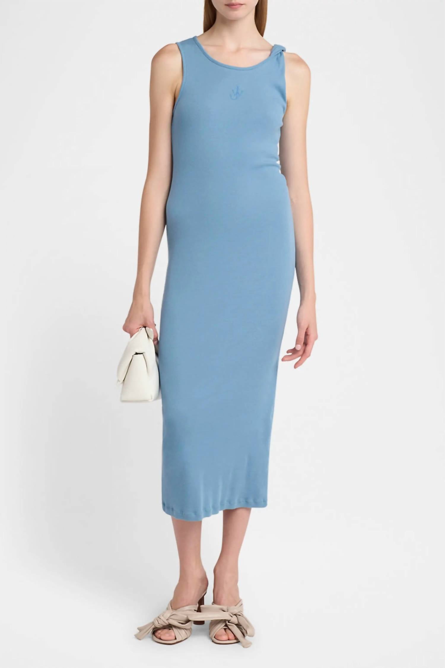 A midi dress so versatile, your options for wearing it are endless. Unveil elegance with the JW Anderson Anchor Embroidery Twisted Strap Dress, a stunning sheath silhouette perfect for a summer holiday party. This sleeveless, sky-blue midi dress boasts a unique twisted strap detail with a scoop neckline and racerback, highlighted by a contrasting anchor embroidery on the upper center front. Composition: 100% Cotton. Closure: Pull-on.