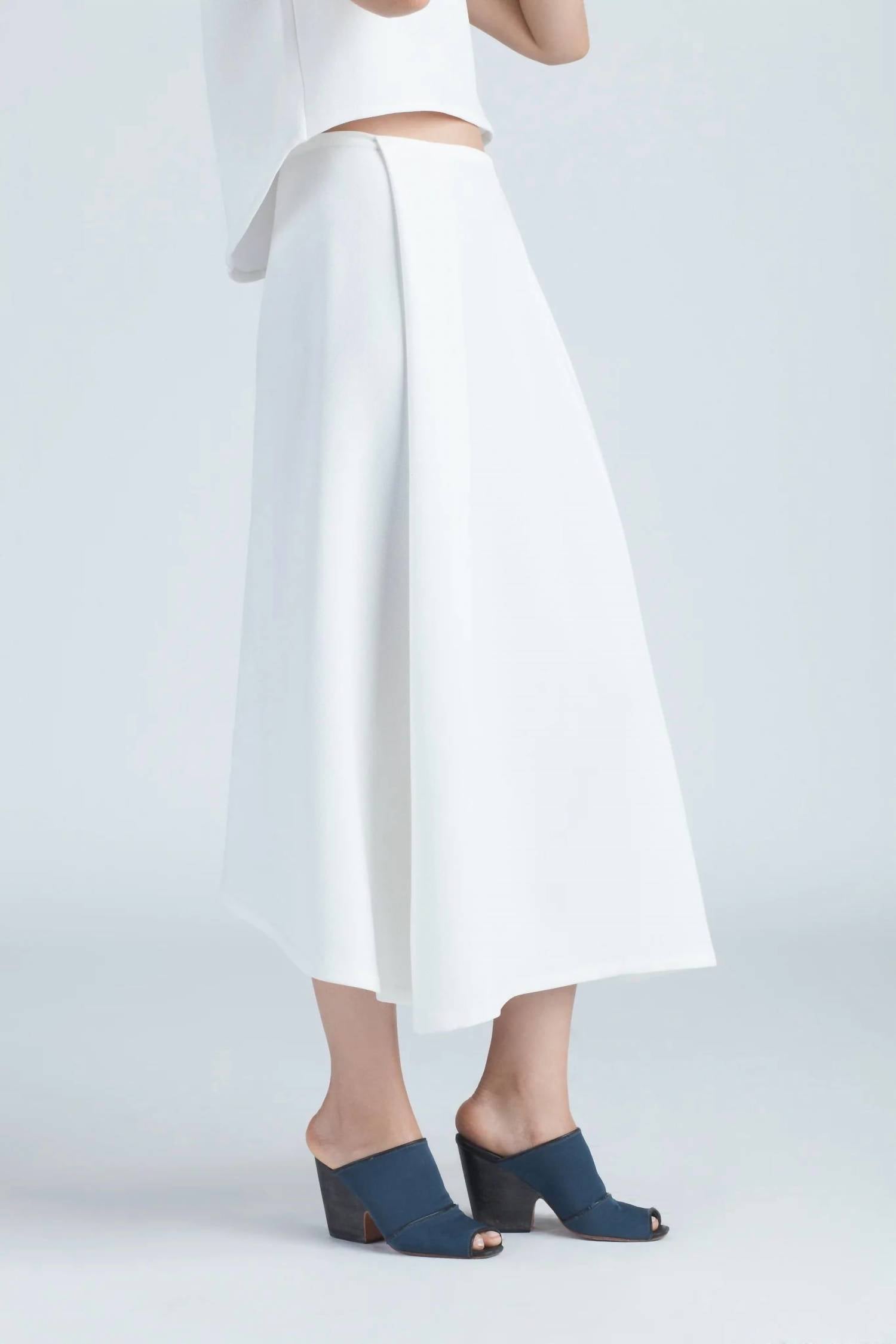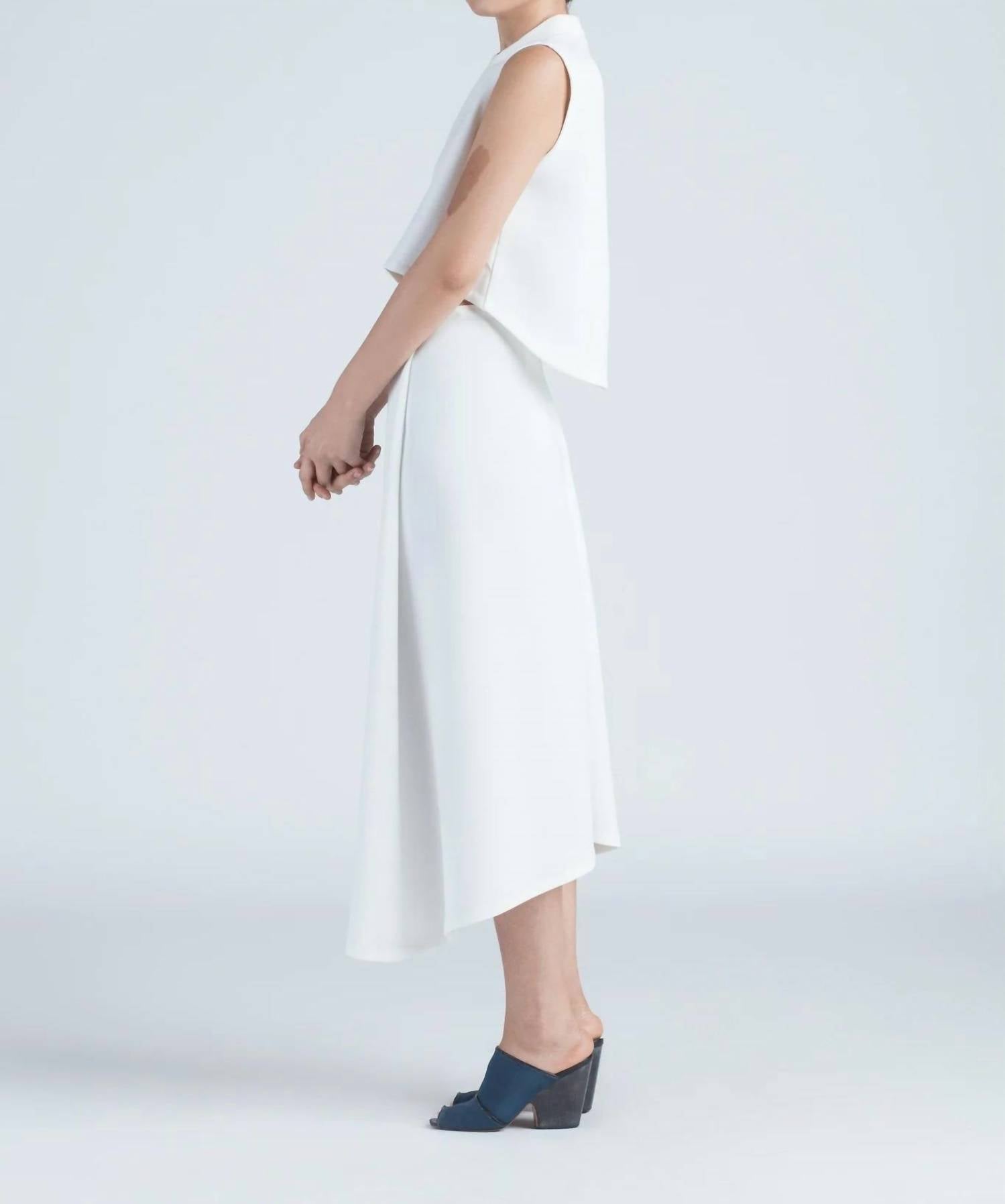Introducing the Kaarem Stream Midi Skirt in serene White, a sophisticated addition that resonates with quiet luxury. Designed with a reverse high-lo, this midi-length skirt features a geometric structure and is longer in the front, offering a unique flow. Made from 100% Crepe Polyester, it boasts a zip closure for seamless wear. Crafted in Vietnam, effortlessly pair this solid, pocketless piece with your favorite top for a chic spring dinner party look. Care instructions: Machine wash and line dry. Model is 5'8" and wearing size small.
