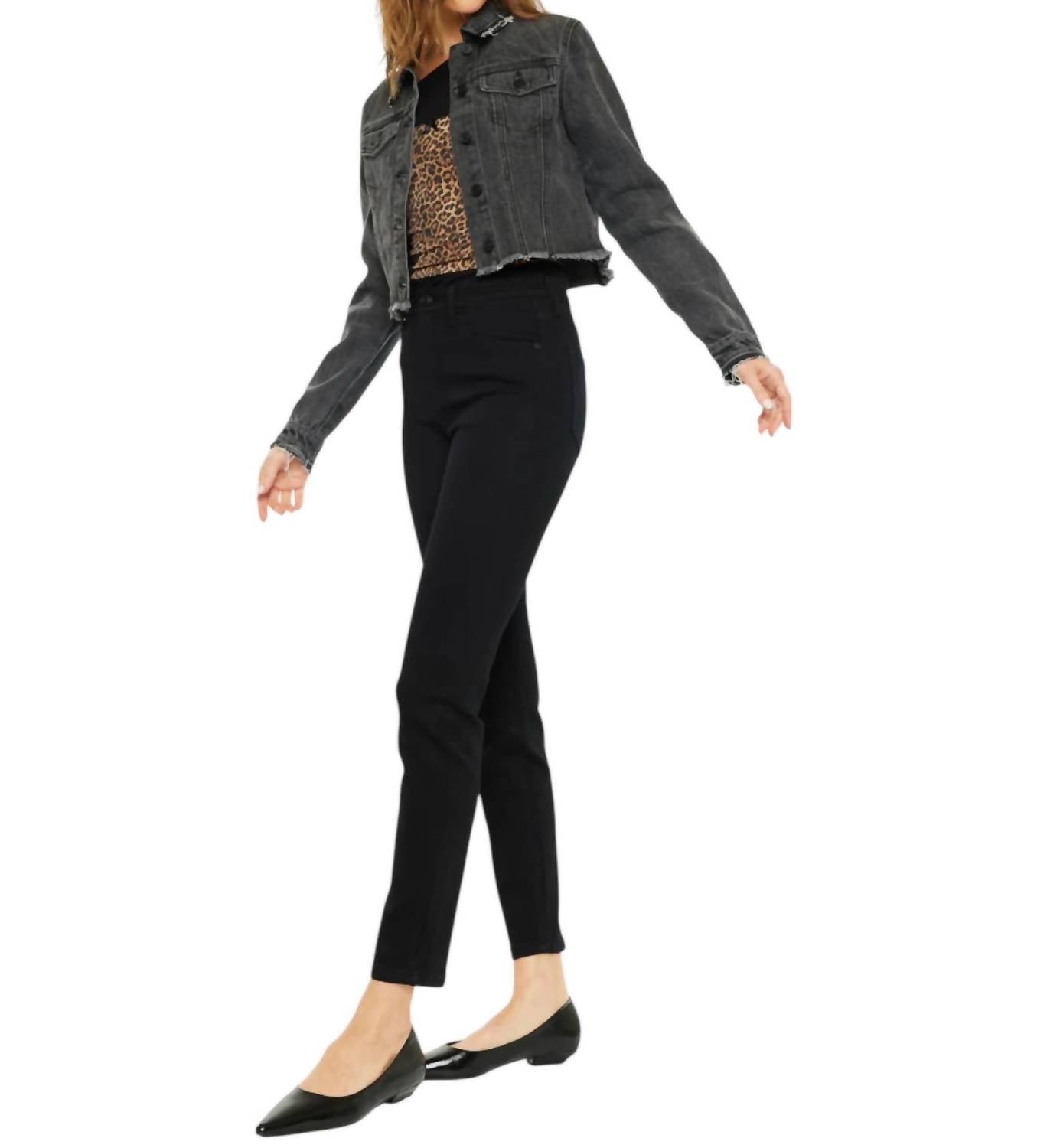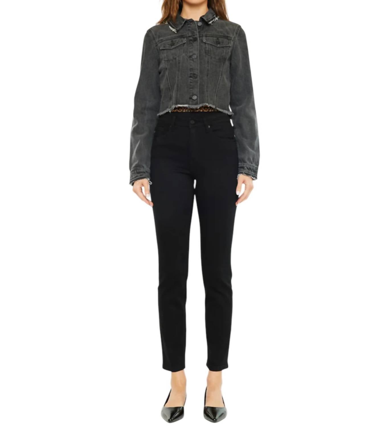 Classic, cool and works with almost any outfit choice. Introducing the Distressed Black Denim Jacket by KanCan, a quintessential addition to your seasonal wardrobe. This long sleeve, cropped jacket is made from 100% cotton, offering a solid pattern with frayed edging and a washed denim look. Closure is secured with buttons, and it features pockets for added utility. Care instructions: Machine wash and tumble dry for effortless maintenance.
