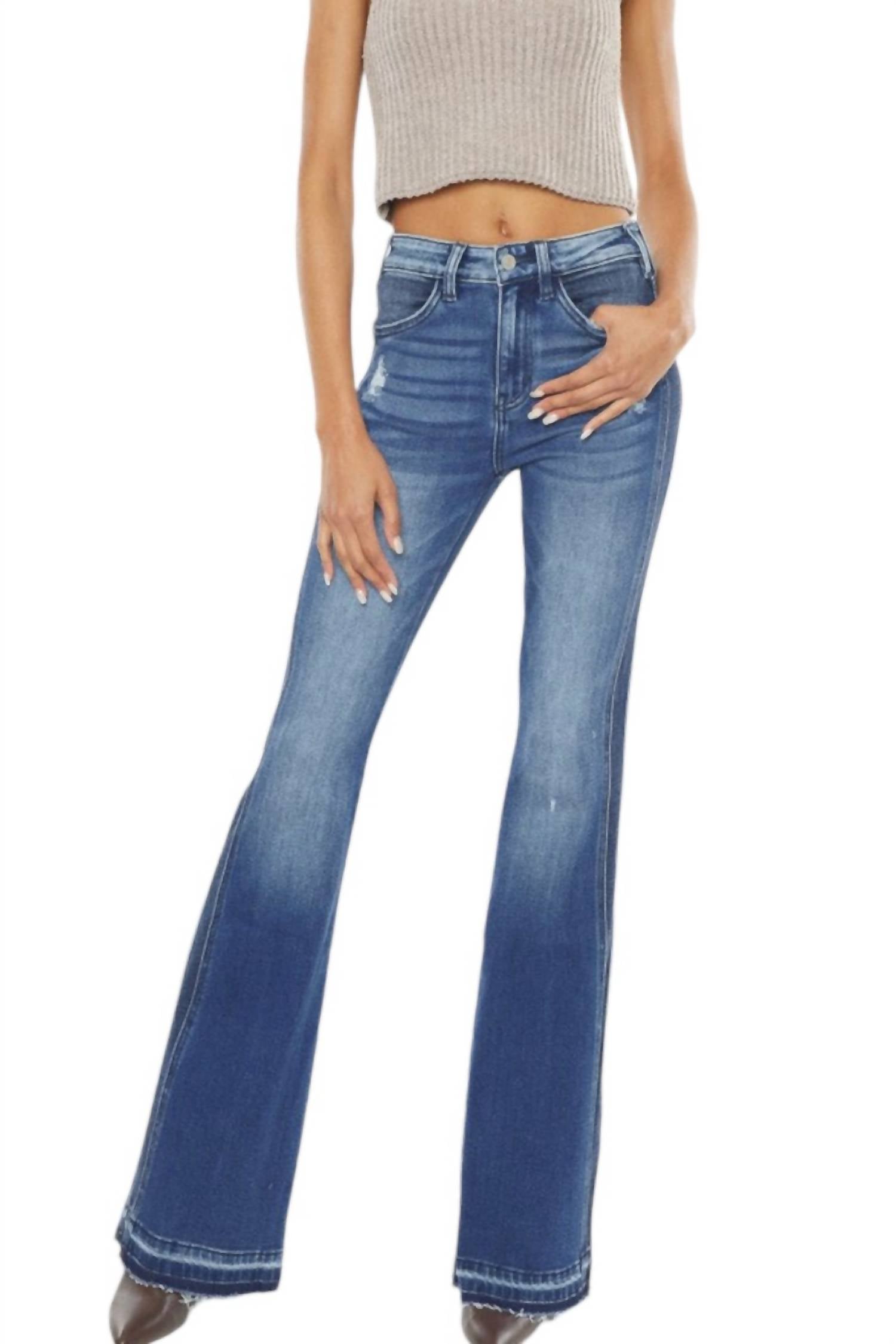 If you're looking for boot-cut, this is the jean for you.Made with a high rise and flare design, this jean features a dark wash with stretch for the perfect fit. Contrast piecing adds an extra touch of detail, while the release hem and zip fly give a modern twist. Material Content: 93% Cotton 5% Polyester 2% Spandex. The size 5/26 has a 10" rise and 34" inseam.