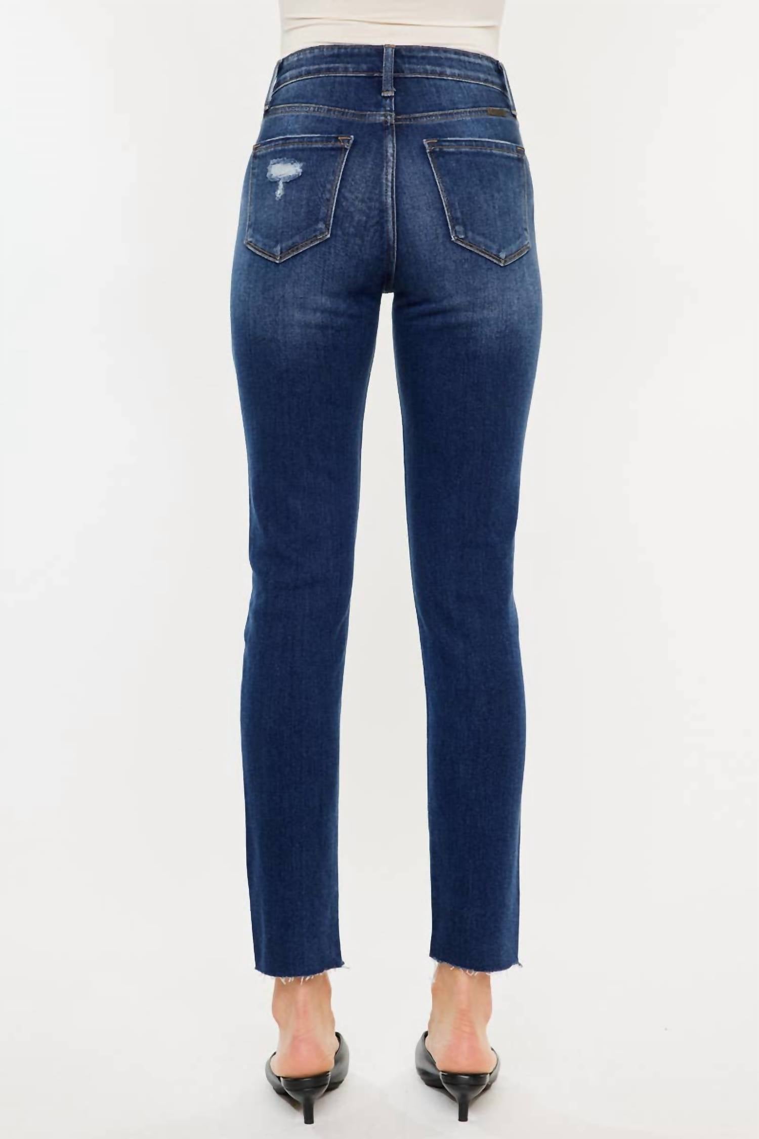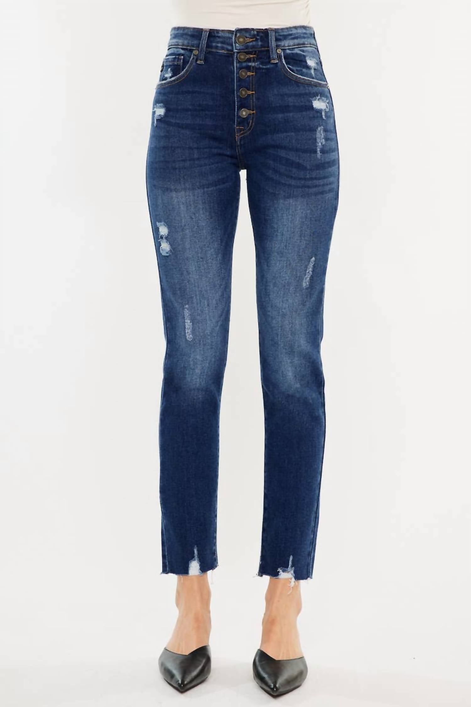 Tuck your favorite tee into these high-waist jeans for a more casual-cool feel. Experience the perfect fit with the KanCan Kalisse High Rise Cigarette Jeans, designed for women seeking a blend of fashion and comfort. These medium wash jeans feature a high rise with a zip closure, offering a sleek skinny leg silhouette. Composed of 93% cotton, 5% polyester, and 2% spandex, they promise comfort stretch and an exposed button fly with a slightly deconstructed hem. With a rise of 11" and an inseam of 28", they are easy to care for with machine wash and tumble dry instructions. Perfect for adding a Y2k vibe to your Spring wardrobe.