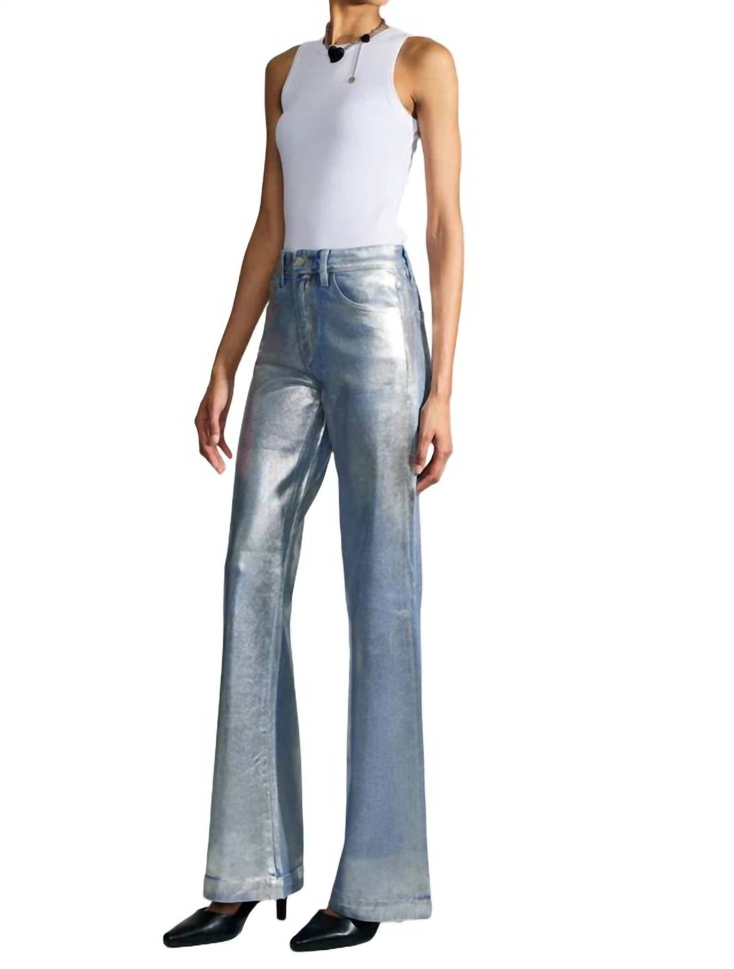 Tuck your favorite tee into these high-waist jeans for a more casual-cool feel.Feature a silver foil detail, a 5-pocket style, one button closure, and a zip fly. The rise is 11" and the inseam is 32" in size 5/26. Made of 99% cotton and 1% spandex, they offer a comfort stretch. The model is wearing size 3/25. They come in a medium wash style.