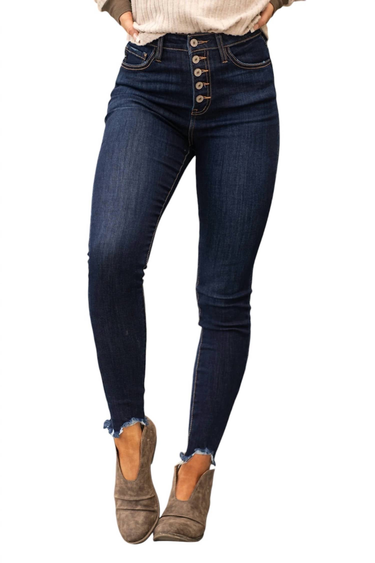 A skinny jean that is both flatering and comfortable. We love this style because it works great with boots, or without! These skinny jeans offer a high-rise fit with an exposed button fly and a dark rinse wash. The stretchy fabric, composed of 80.4% cotton, 11% polyester, 6.6% modal, and 2% spandex, provides comfort and flexibility. They feature a frayed hem and are machine washable in cold water. True to size, with a rise of 11 inches and an inseam of 28 inches.