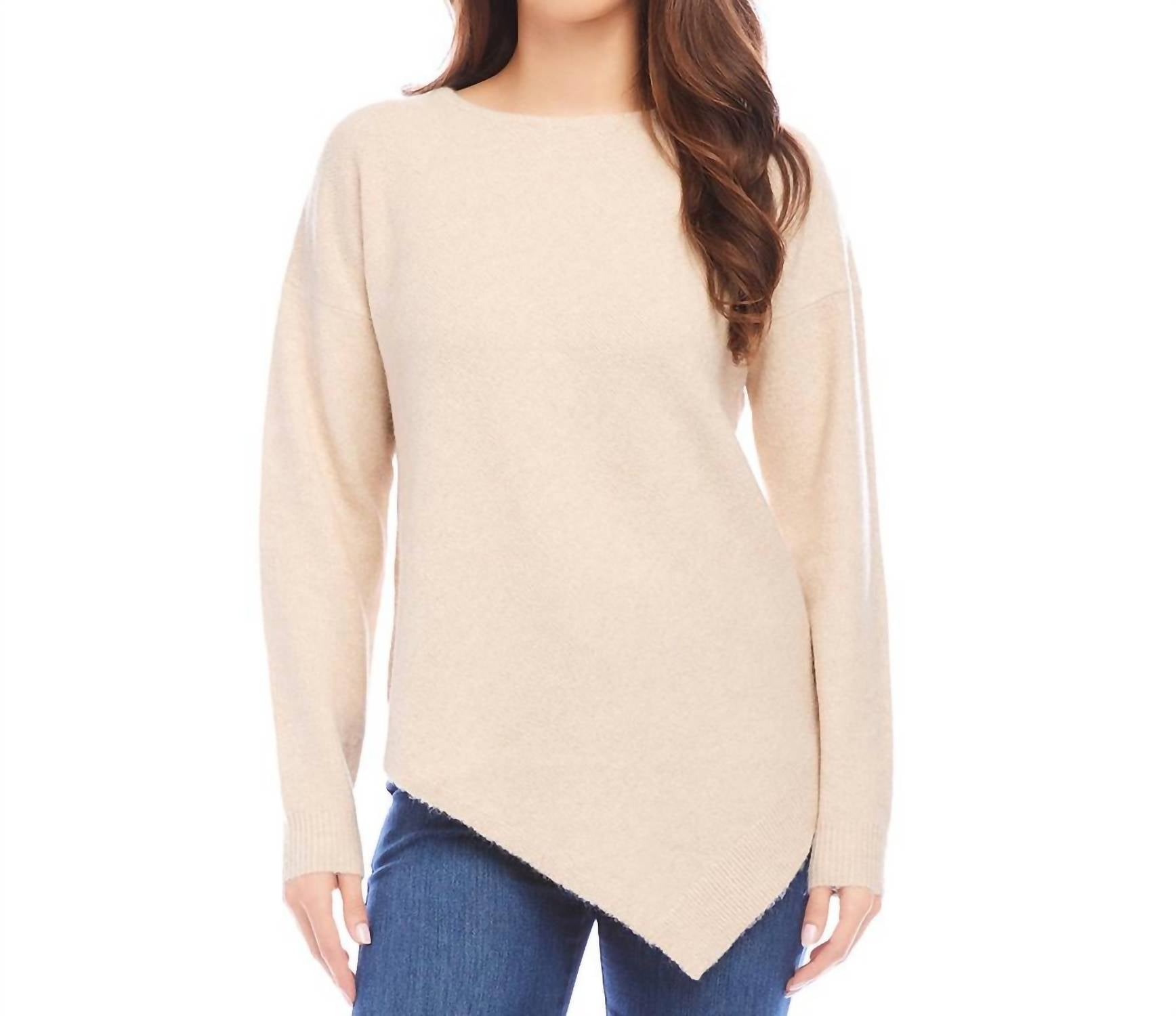 This cardigan will be a sweater-rotation favorite. Elevate your wardrobe with the Karen Kane Asymmetric Hem Sweater, a chic choice for spring vacations in a versatile sand hue. This long sleeve sweater is crafted from a blend of 33% recycled polyester, 26% acrylic, 24% polyester, 14% nylon, and 3% spandex for a soft and relaxed fit that flatters all shapes. It features a stylish boatneck and ribbed hem detail, with an easy pull-on closure for added convenience. Made with attention to detail, it measures 30 1/2 inches in length for size M and requires dry cleaning care.