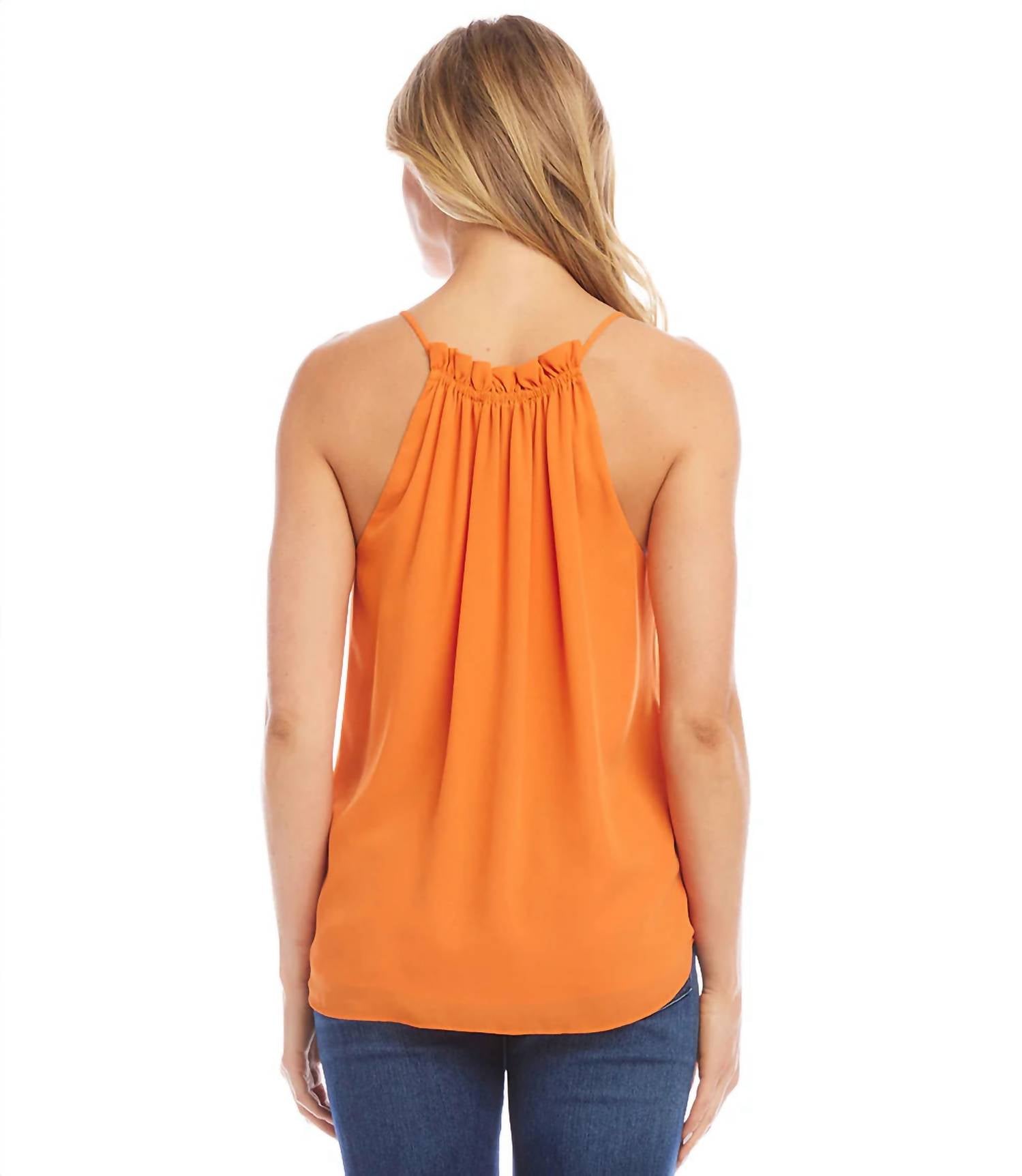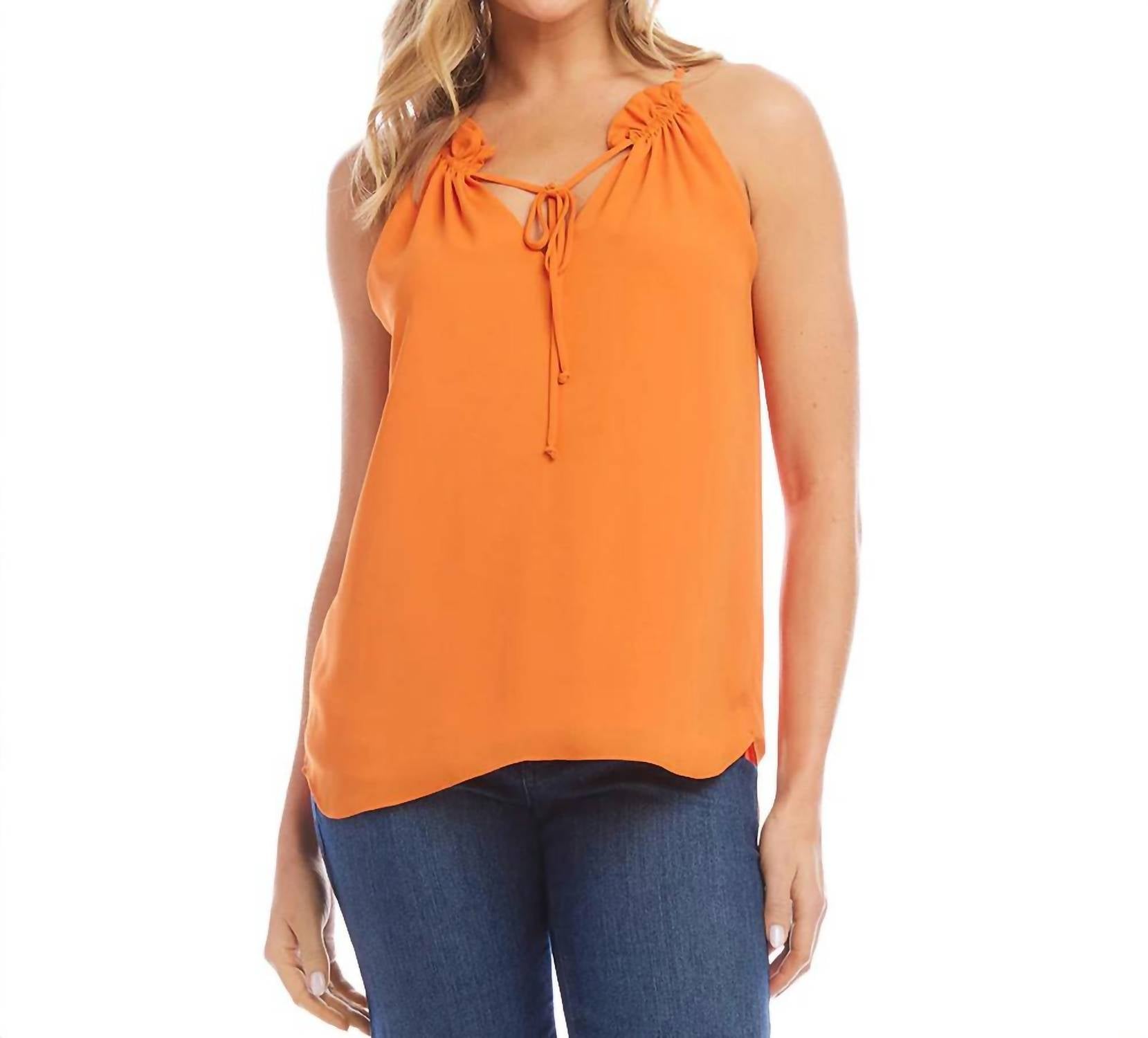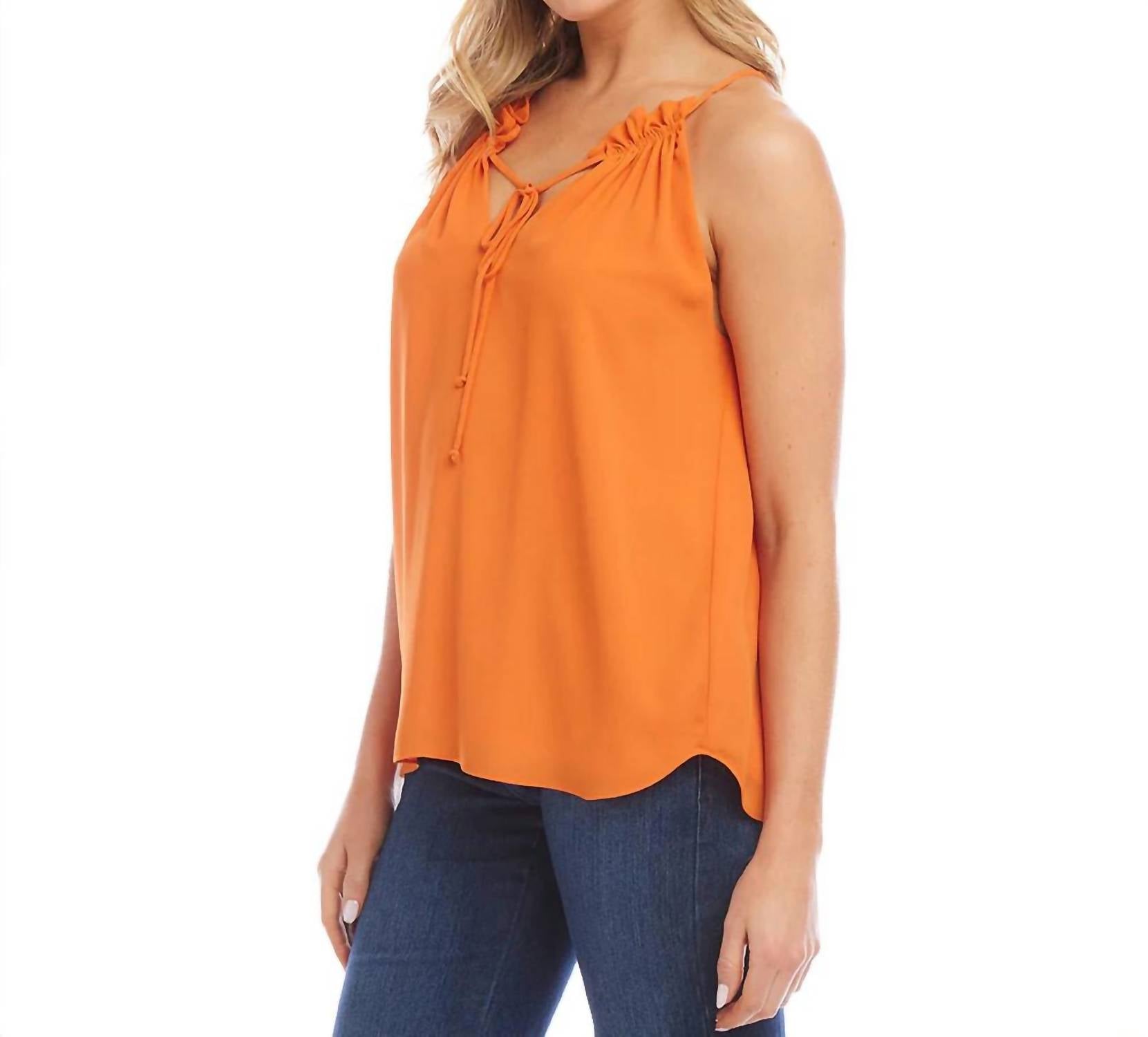 This classic tank top is perfect for layering and cute enough to wear on its own. Discover the Tangerine Keyhole Tank by Karen Kane, a perfect blend of style and refinement for any wardrobe. Featuring a sleeveless design with spaghetti straps and adjustable ties, this tank offers a personalized fit. Composed of silky crepe material, 100% polyester, this piece is made in the USA and offers a graceful drape. Closure: Tie closure. For care, dry clean for best results or hand wash and hang to dry. Length: 25 5/8 inches (size M).
