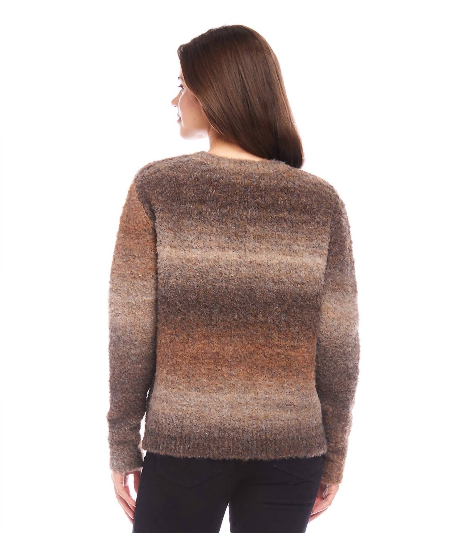Throw this adorable cardigan over any cami or tank top. Experience the cozy elegance of the Karen Kane Ombre Boucle Sweater, perfect for Fall housewarming gatherings. This long sleeve cardigan features a unique ombre pattern in brown, crafted from a blend of 35% recycled polyester, 26% polyester, 25% nylon, 12% wool, and 2% spandex, allowing for a comfortable loose fit. Imported with a crew neck and measuring 23 1/2 inches in length for size M, its pull-on style ensures ease of wear. Care for this stylish piece by dry cleaning only, making it an ideal choice for the conscious fashion enthusiast.
