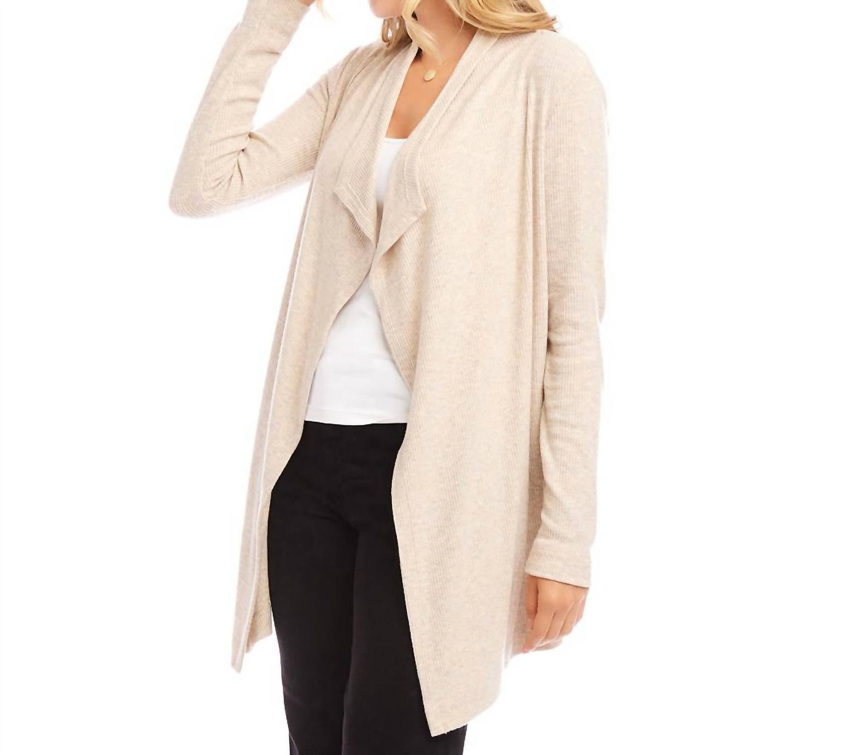Throw this adorable cardigan over any cami or tank top. Meet the Ribbed Drape Front Cardigan by Karen Kane, the ultimate versatile piece for your dinner party ensemble. Crafted from a soft, brushed ribbed material, this women’s long-sleeve cardigan combines 96% viscose with 4% spandex for a stylishly warm fit. Length: 30 inches (size M). Origin: Made in the USA. Closure: Open front. Care: Hand wash in cold water, and lay flat to dry.