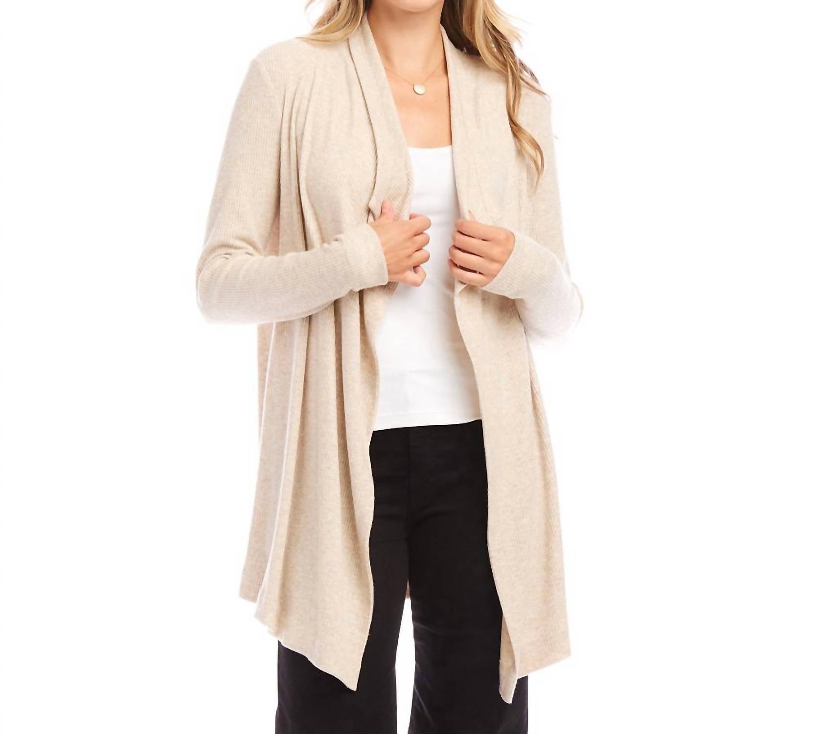 Meet the Ribbed Drape Front Cardigan by Karen Kane, the ultimate versatile piece for your dinner party ensemble. Crafted from a soft, brushed ribbed material, this women’s long-sleeve cardigan combines 96% viscose with 4% spandex for a stylishly warm fit. Length: 30 inches (size M). Origin: Made in the USA. Closure: Open front. Care: Hand wash in cold water, and lay flat to dry.