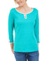 The comfortable cotton knit style of Karen Scott's scoop-neck top is brightly detailed with contrast and button trim at the double keyhole and slit sleeve edges. | Relaxed fit; approx. 26" long| Due to generous sizing| we suggest sizing down for the perfect fit| Scoop neckline with contrast trim and keyhole with button detail| 3/4-sleeves with contrast-trimslit edges with button detail