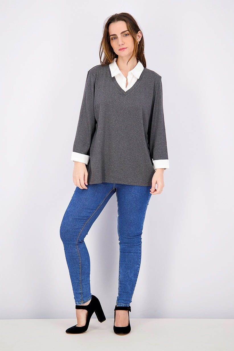 Relaxed fit; hits at hip; approx. 26" long|Due to generous sizing, we suggest sizing down for the perfect fit|Point collar|Layered-look with shirt-style insets at neckline and cuffs|Cotton
