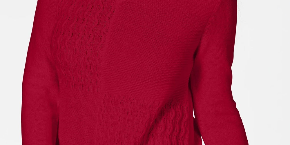 Relaxed fit; hits at hip; approx. 28-1/2" long|Due to generous sizing, we suggest sizing down for the perfect fit|V-neck|Blocks of mixed knit stitches at front; ribbed hemline band with side vents|Long sleeves with ribbed cuffs