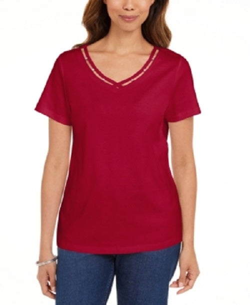 Karen Scott Women's Cotton Open-Trim V-Neck T-Shirt Bright Red Size Medium