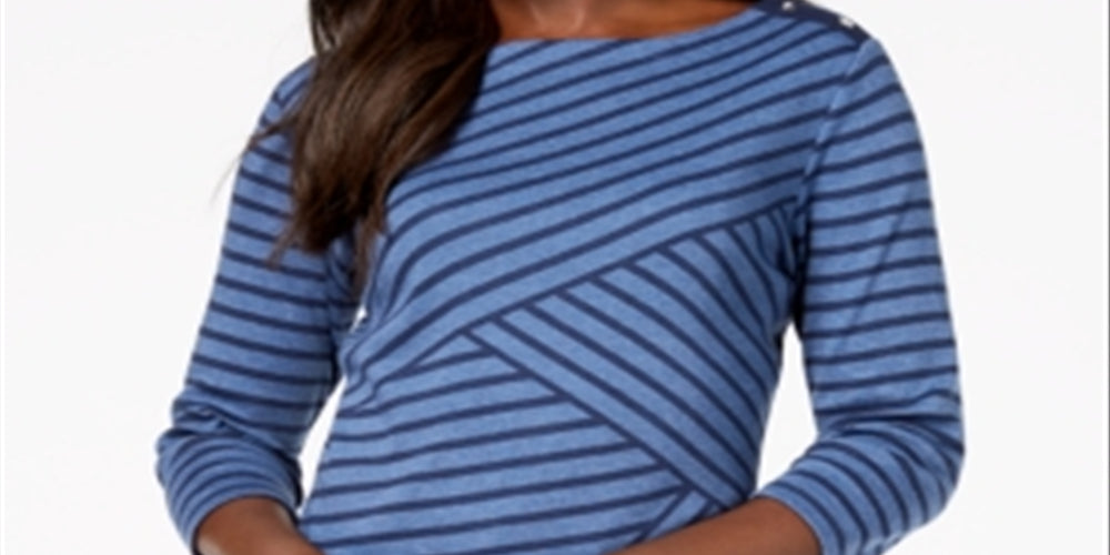 A mix of stripes decorates this casual Karen Scott top| a relaxed pick styled with 3/4-sleeves and a sweeping boat neckline