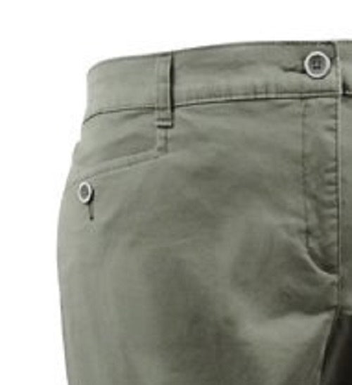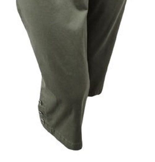 Approx. inseam: 21"|Mid rise|Zipper and button closure; belt loops|Slit pockets at front; welt pocket at back; button trim at cuffs|Cotton/spandex|Machine washable