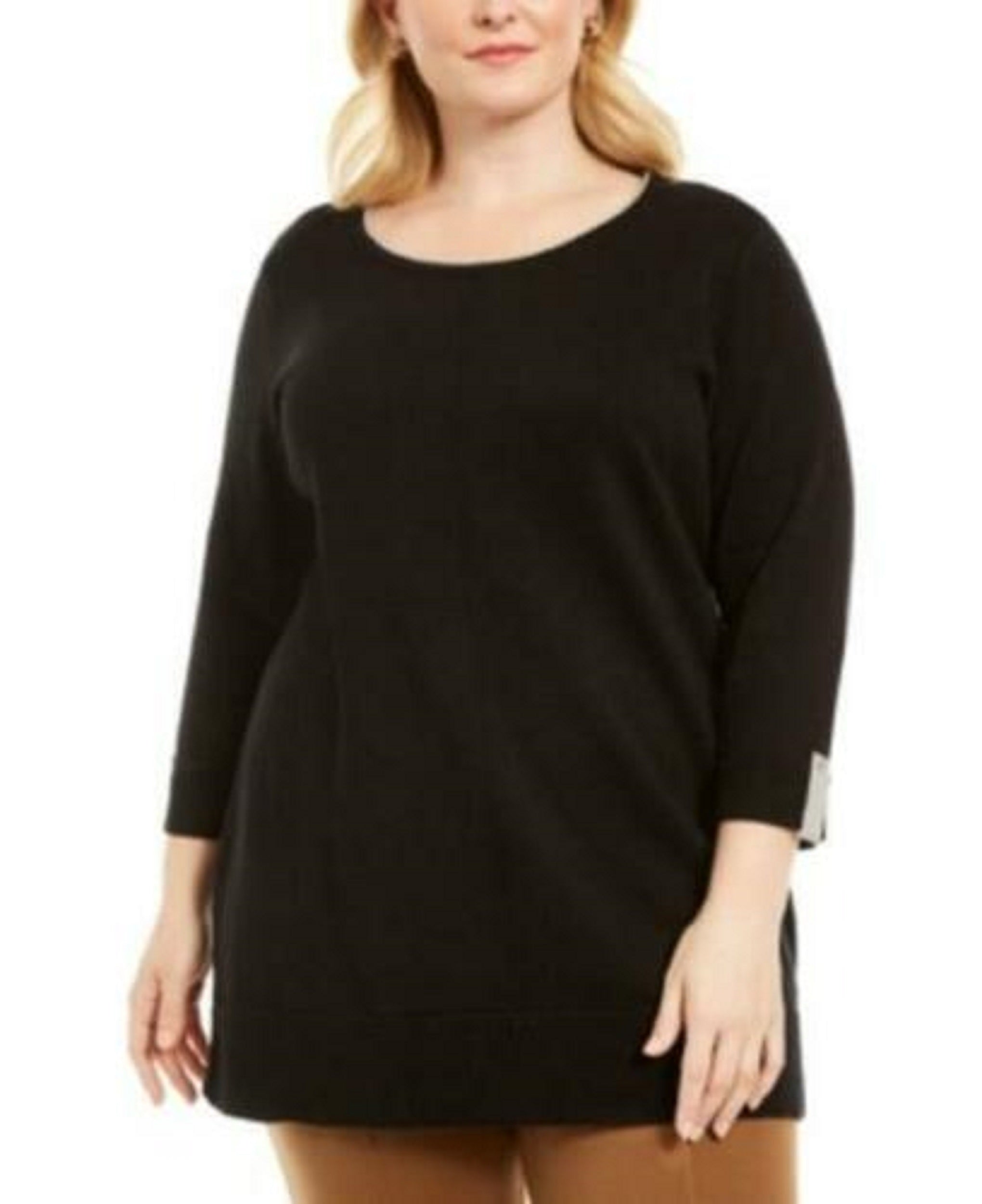 Relaxed fit; approx. 32" long Scoop neckline with rolled and ribbed detail Seam detail at center front; ribbed hemline band with side slits 3/4-sleeves with ribbed cuffs and button-trimmed tabs All cotton