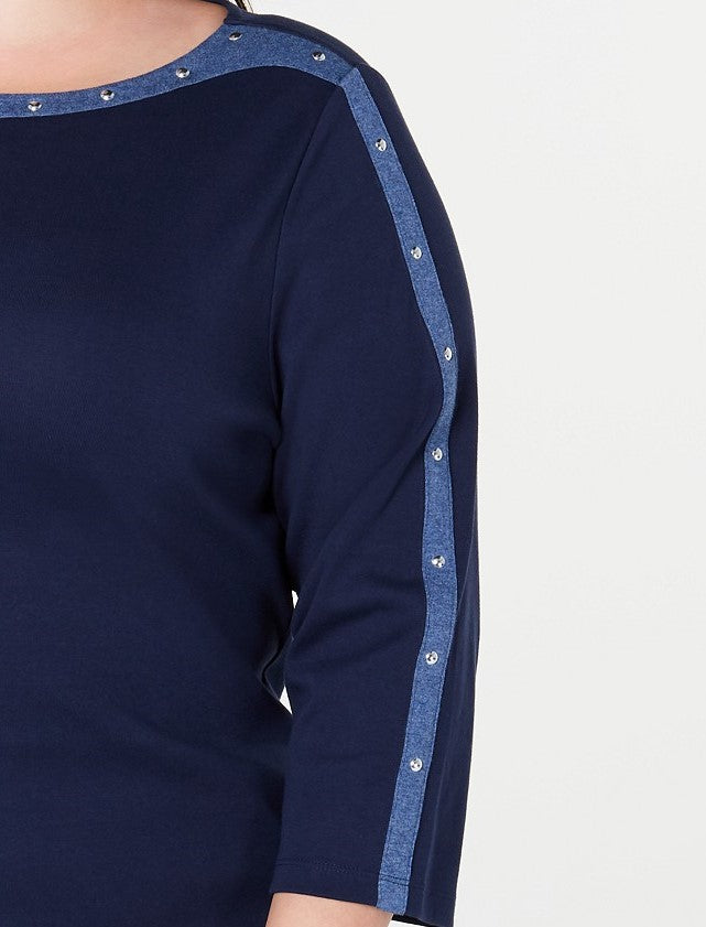 Relaxed fit; hits at hip; approx. 28" long from center back neck|Boat neckline|Contrast stripe with studs at neckline, sleeves|3/4-sleeves