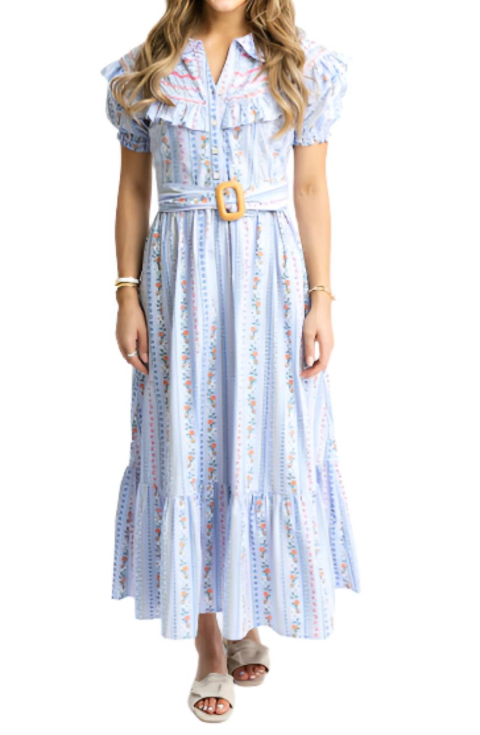 Who doesn't love a good maxi dress? This one you'll be reaching for season after season. Introducing the French Floral Embroidered Vine Dress by Karlie, perfect for a maximalist Spring vacation. This captivating A-line maxi dress features short sleeves and a striking collar, adorned with a floral pattern in a blue multi-color scheme. Crafted with a button closure for easy wear, it comes complete with a stylish belt to enhance your silhouette. Care instructions include hand washing and line drying to maintain the dress's impeccable quality.