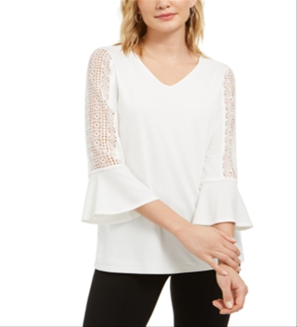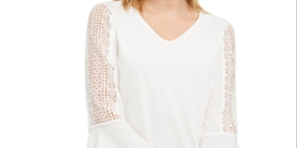 Kasper Women's Crochet Sleeve V Neck Knit Top White Size M