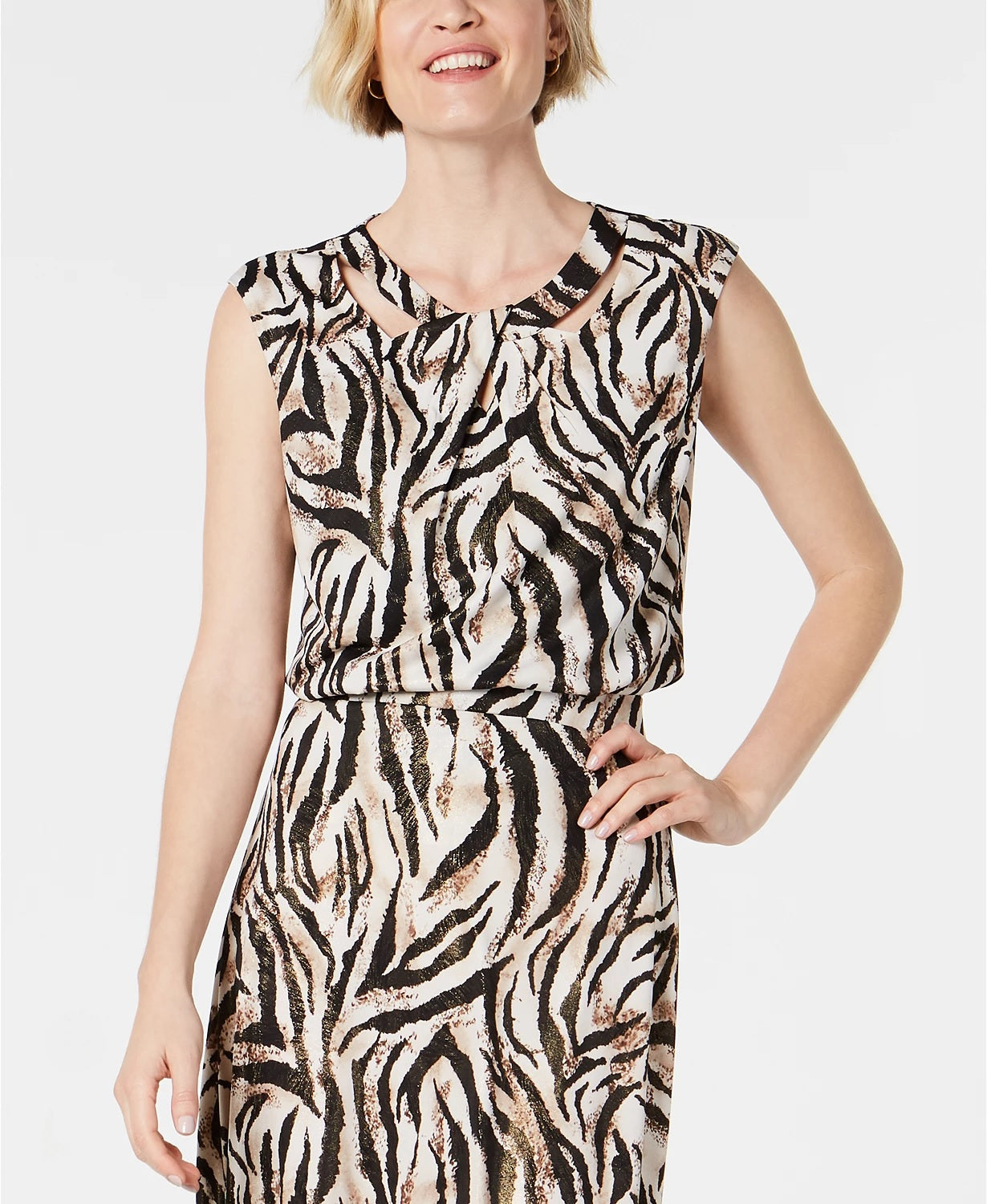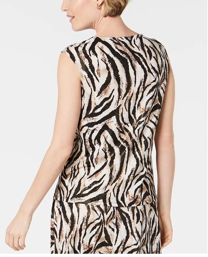 A crossover twist loops through the cutouts at the neckline of Kasper's stylish stretch-knit shell.|Cap sleeves|Crossover twist detail at neckline with cutouts