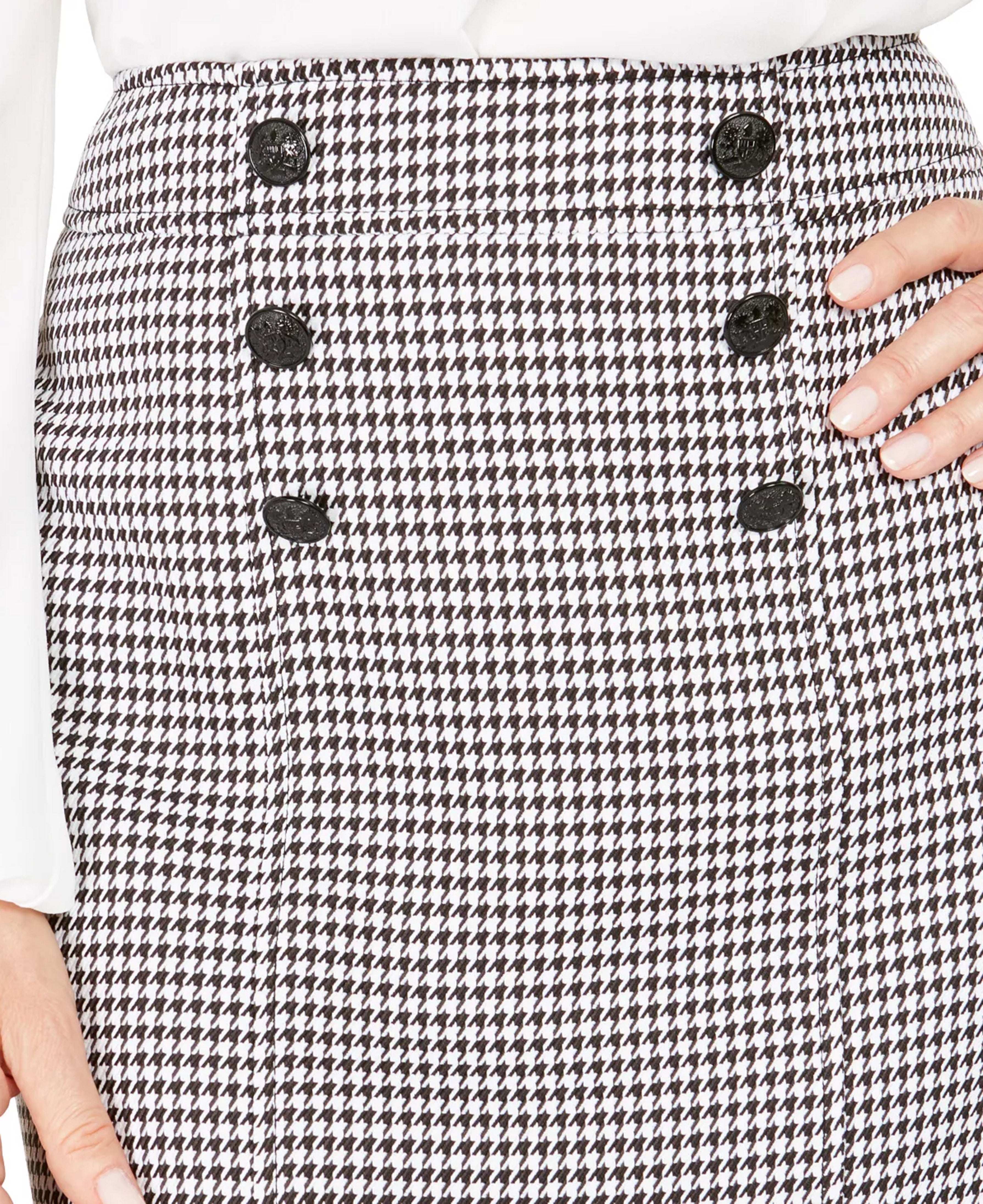 Approx. 23-1/2 long; pencil silhouette|Hidden back zipper and hook and eye closure|Houndstooth print; decorative buttons at front|Lined|Polyester/elastane; lining; polyester
