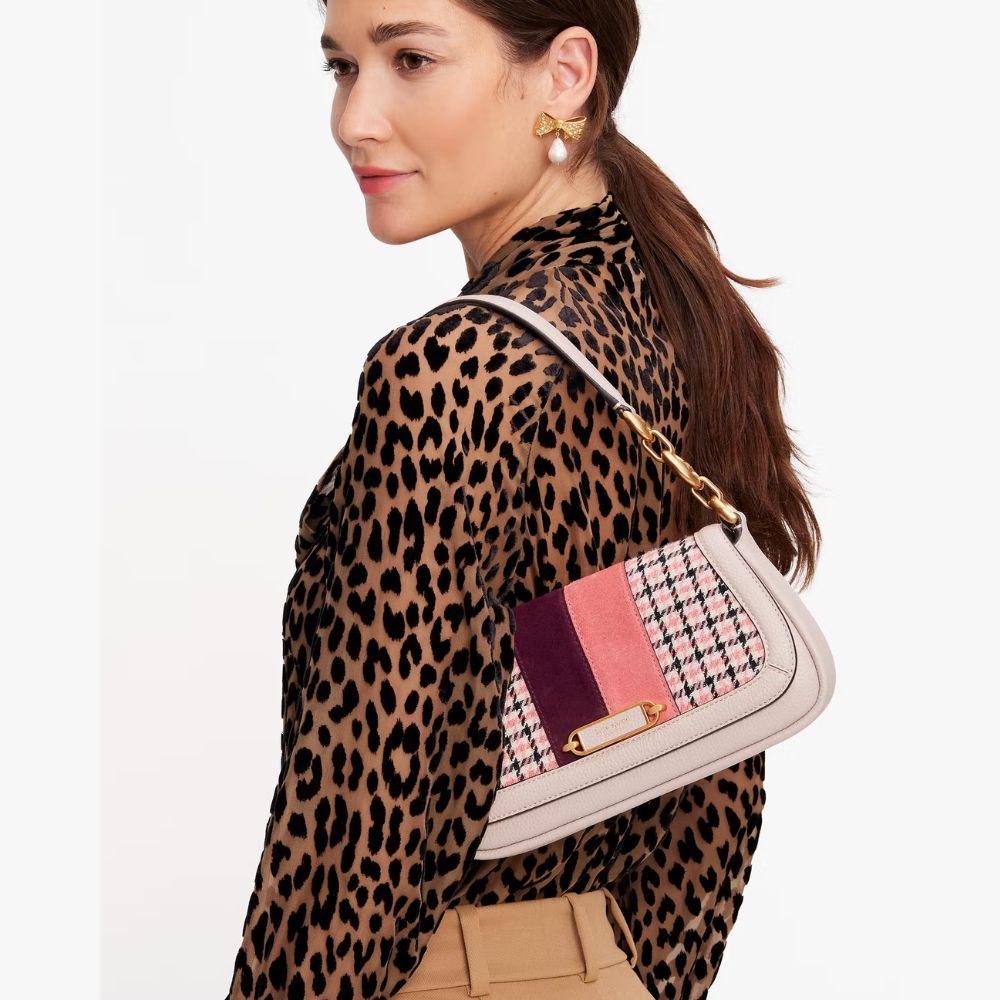 This small shoulder bag from Kate Spade is exactly what you need to bring designer style to your everyday look! Made in a beautiful plaid twill with racing stripe detailing, you'll love the patterned look. Small in size, this bag has a magnetic snap-flap closure and an optional crossbody strap. It finishes off its impressive look with a plaque logo!