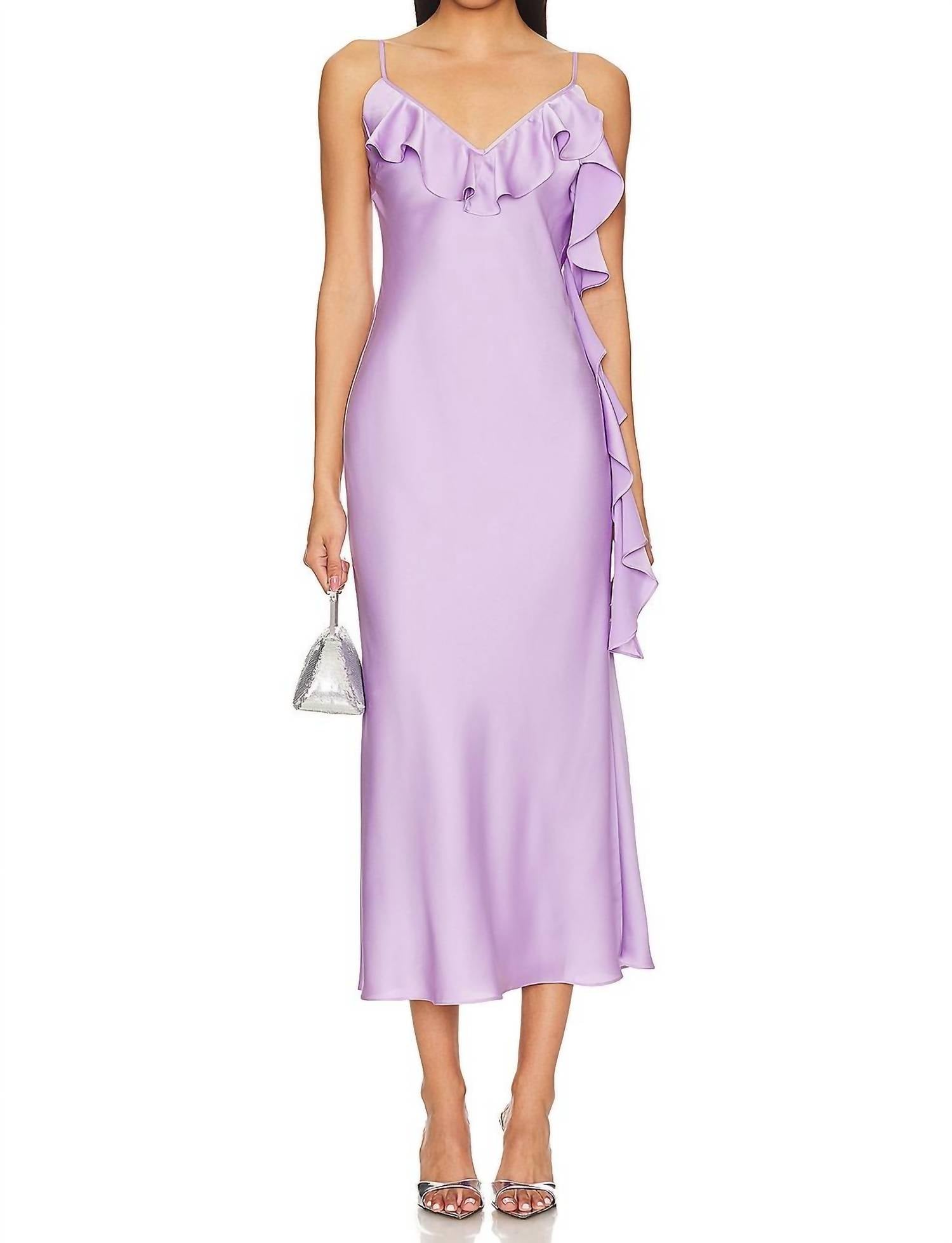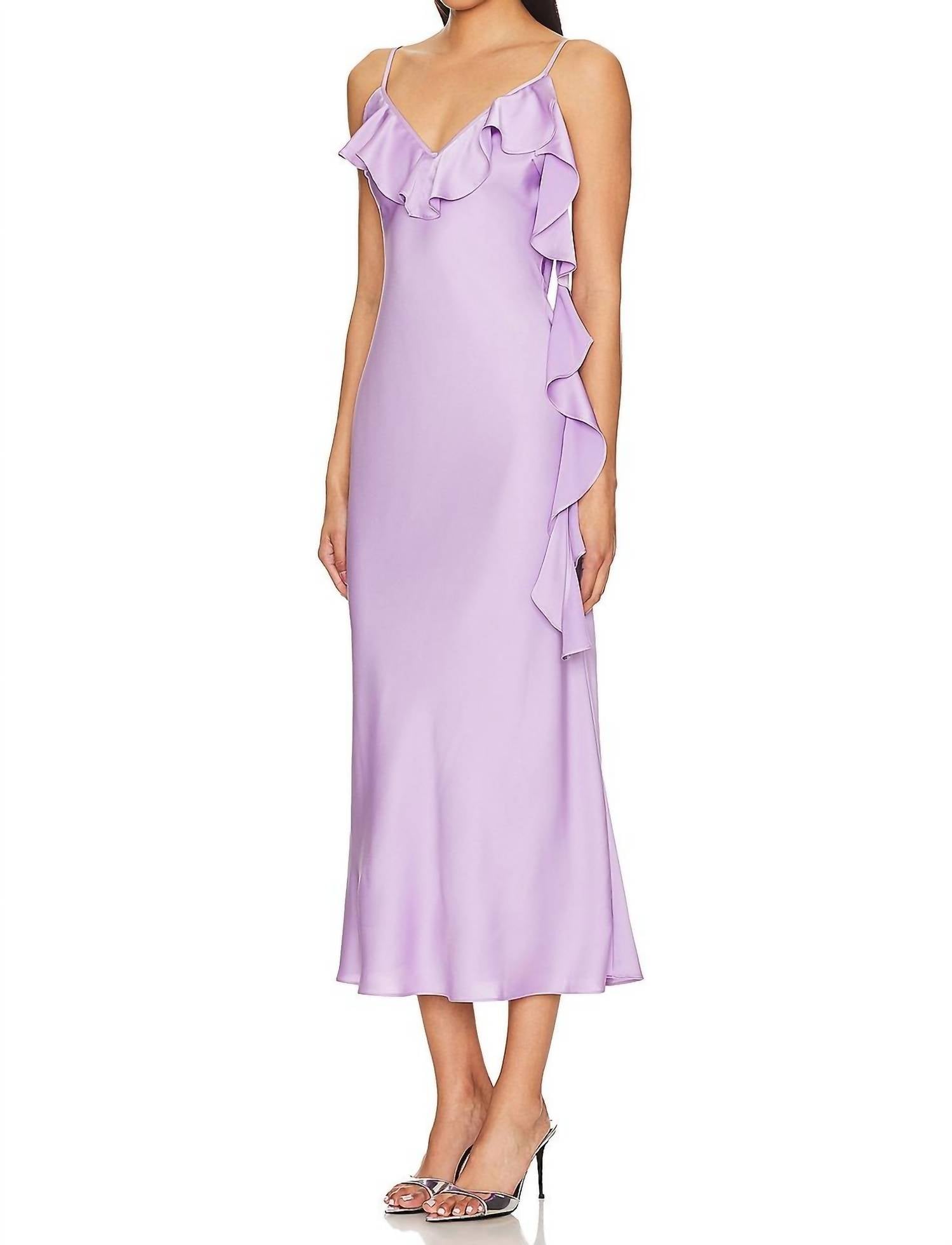 A maxi dress that is just as cute as it is comfortable. Step into elegance with the Adrienne Midi Dress by Katie May, a stunning piece in the subtle shade of Whisper Lilac. This maxi dress features delicate spaghetti straps and a sophisticated satin fabric with a draped neckline ruffle, perfect for evening events. Made in the USA, it boasts a solid pattern and slip silhouette, ensuring a minimalist appeal for spring occasions. Closure is a side zipper, and the dress requires professional dry cleaning to maintain its luxurious allure. Fabric and lining: 100% Polyester.