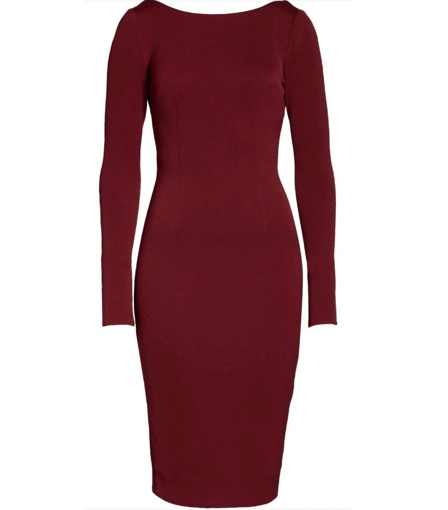 Just add slides or mules and you are good to go. Unveil elegance with the Surrender Drape Cowl Back Midi Dress by Katie May. This burgundy sheath dress, perfect for a dinner party, features long sleeves and a classic boat neckline. Crafted in 97% polyester and 3% spandex, it is fully lined with 100% polyester, offering a flattering silhouette. With a concealed side zip closure and a minimalist design, it requires dry cleaning to maintain its allure.