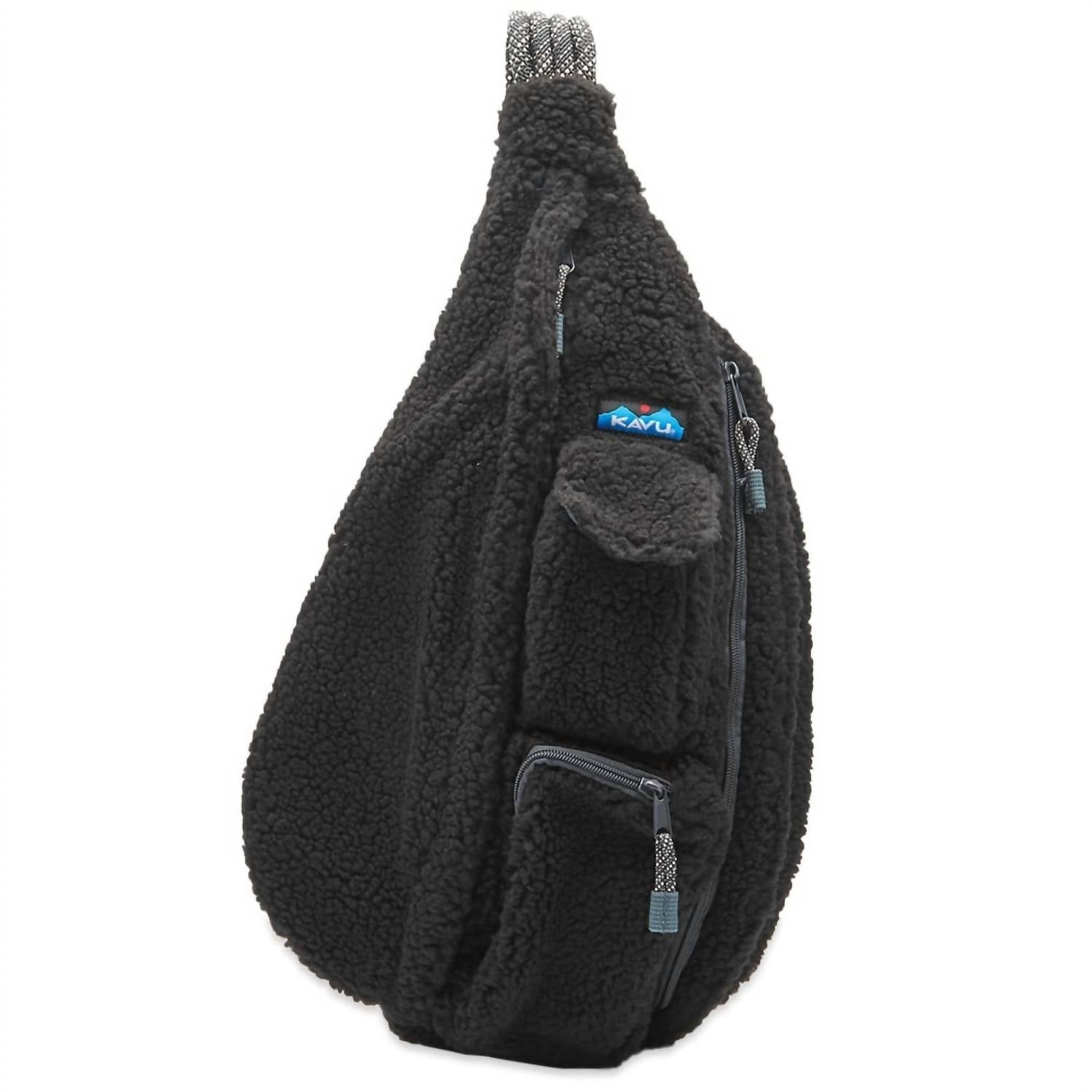 Introducing the KAVU Rope Fleece Bag in Jet Black, a stylish and functional accessory for your winter adventures. Crafted from a plush blend of 85% polyester and 15% acrylic Sherpa fleece, this sling pack offers warmth and durability. It features an adjustable rope shoulder strap with a side release buckle, two vertical zip compartments, and two key or cell phone pockets for organized storage. With dimensions of 20"x11"x5" and a cross body strap length ranging from 22"-44", this bag is both versatile and cozy, featuring a padded back with KAVU embroidery.