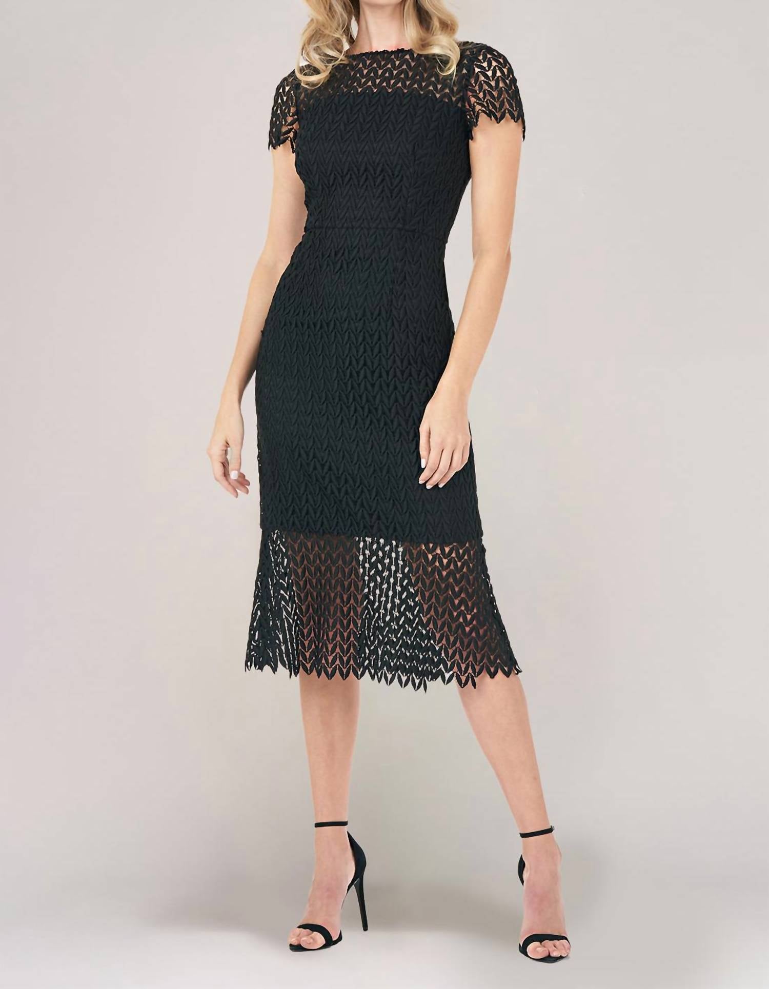 The perfect length dress does exist. Introducing the Women's Tatum Dress by Kay Unger, perfect for making a statement at any dinner party. This elegant black midi dress showcases a textured A-line silhouette with a timeless crewneck and short sleeves. Crafted with a pull-on closure for ease of wear, it embodies the chic monochrome trend. Care for this summer essential with dry clean only instructions. 100% Polyester