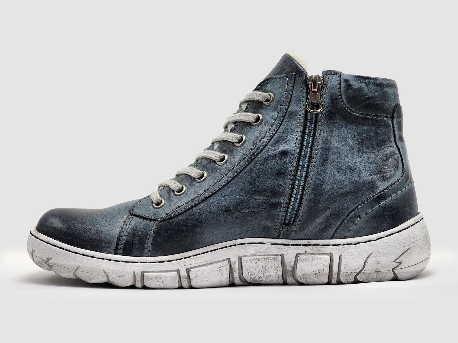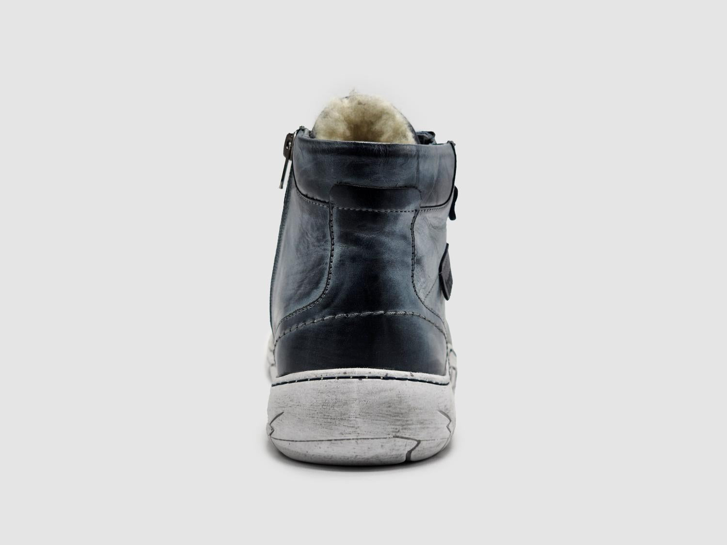 Classic blue color for a versatile, stylish look. Thick wool lining for added warmth and comfort. Zip-up design for easy on and off. Durable and comfortable for all-day wear. Ideal for casual outings or rugged adventures. Combines functionality and fashion seamlessly. Runs true to size. Handcrafted in Poland with high-quality leather.