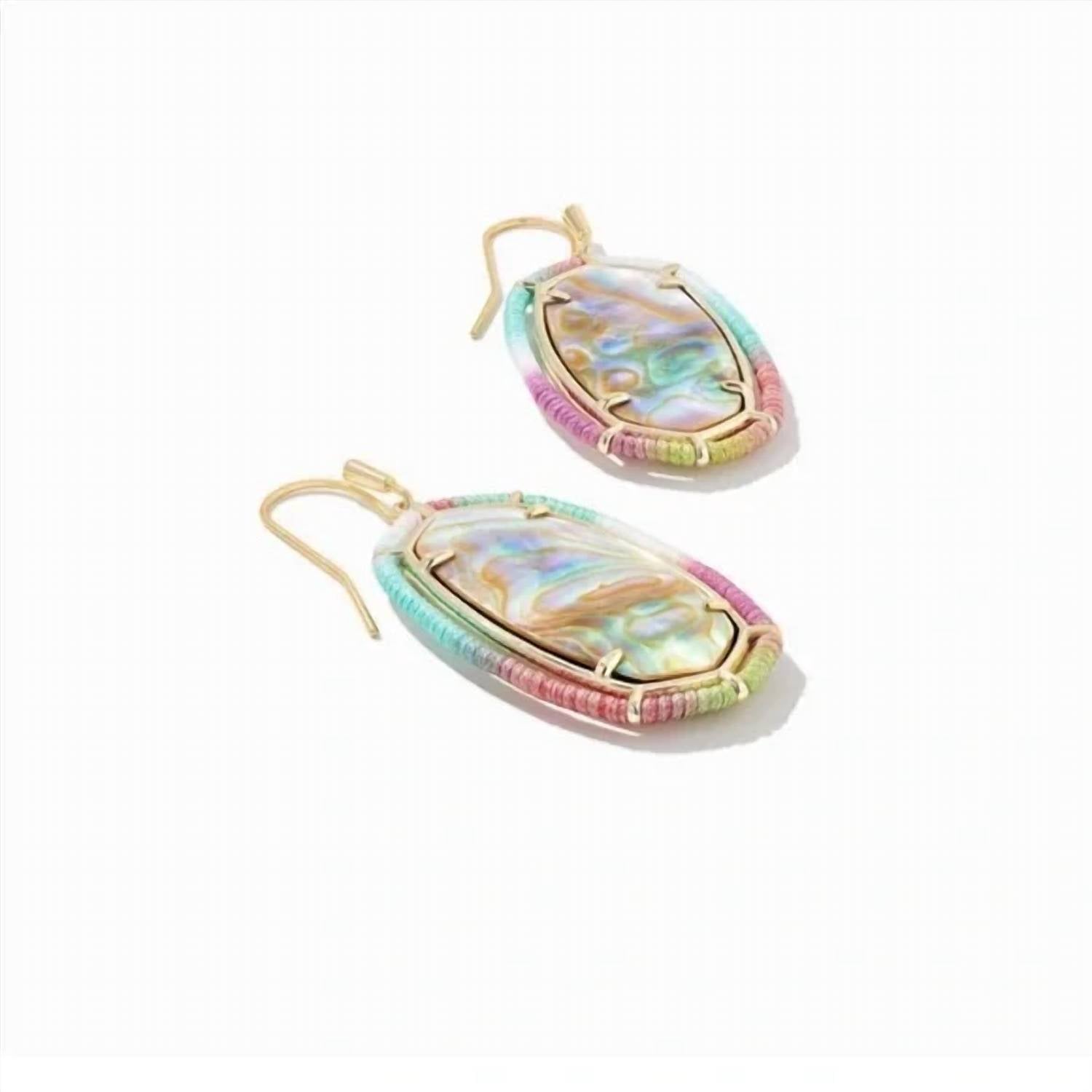 Classic earrings that will take you from season to season. Add a splash of color to your wardrobe with the Women's Threaded Elle Drop Earrings by Kendra Scott. These earrings are inlaid with genuine custom-cut shells encircled by a colorful, hand-wrapped frame for a textured, handcrafted look. Made with 14k gold plated over brass, these earrings measure 1.65 inches in length and 0.83 inches in width, featuring a pastel mix of glass-plated iridescent abalone and ombre cord. The easy-to-wear earwire closure ensures they are a breeze to add to your everyday style.