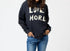 Embrace casual elegance with the Boyfriend Love More Hoodie by KERRI ROSENTHAL, a stylish piece in timeless black. This hoodie features long sleeves and a relaxing drop shoulder design for a comfortable fit. Made from 100% Cotton Fleece and adorned with 'Love More' artwork, it showcases an embroidered heart at the back shoulder. This hoodie is imported and features a hooded crew neck with a versatile pull-on closure. Machine wash.