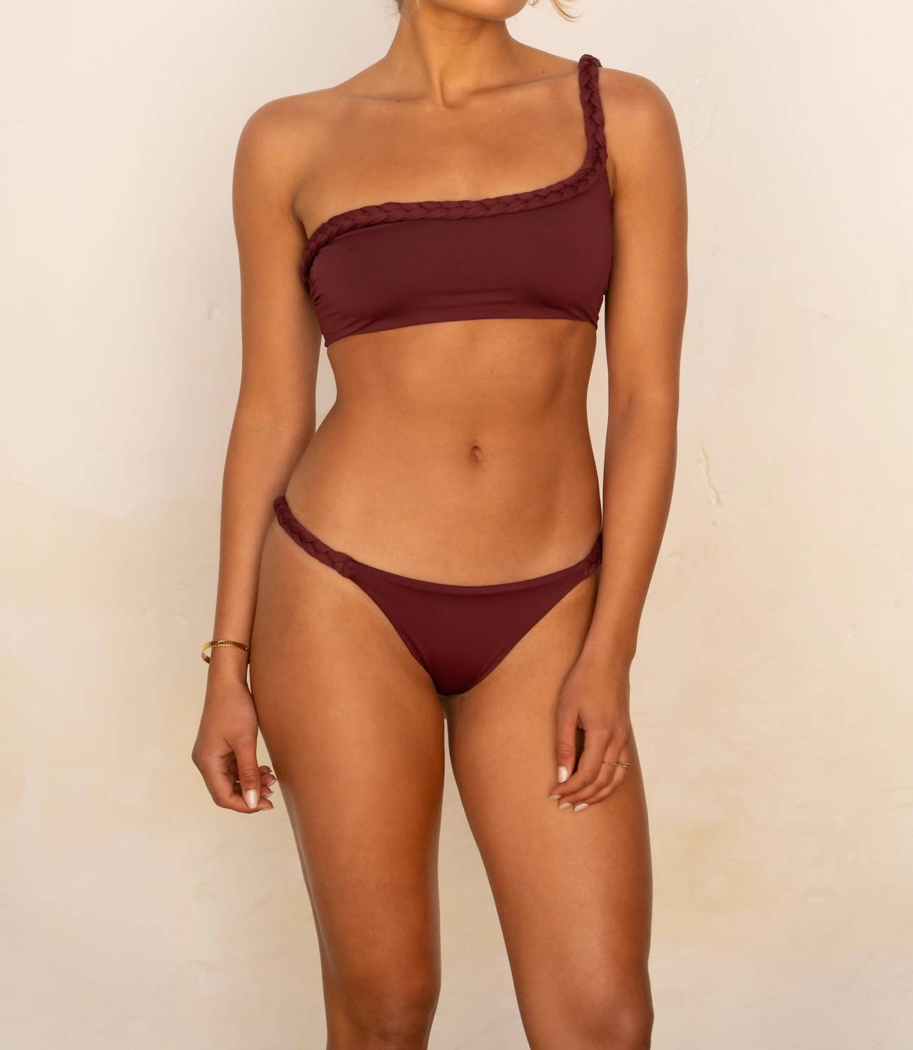 This cute and flattering swimsuit is perfect for making a splash at the pool, lounging on sun-kissed beaches, and staying stylish throughout the upcoming summer season. Elevate your beachwear with the Lisa Top by Khaven, a chic aubergine bikini featuring an asymmetrical bandeau shape. This swim top is crafted from a nylon blend, offering a solid pattern that complements its one-shoulder design with a signature braided strap. Perfect for small to medium sizes, the double-lined fabric ensures comfort, opacity, and durability. Care for this versatile piece with machine wash and tumble dry instructions, making it ideal for summer beach days.