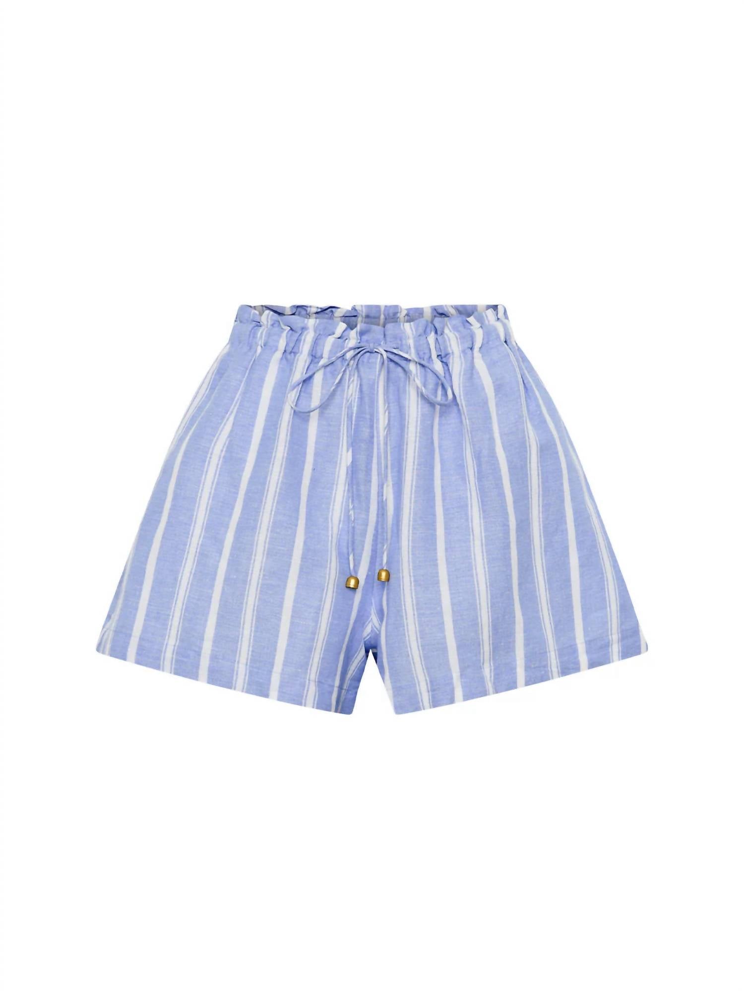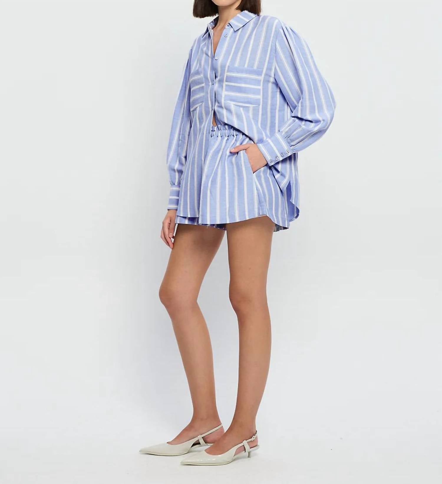 Tuck your favorite tee into these high-waist shorts for a more casual-cool feel. Embrace effortless style with the Capri Stripe Short by KIVARI, featuring a charming blue and white stripe pattern perfect for summer getaways. These shorts boast an elasticated waistband with a rope tie closure for a comfortable fit and come equipped with practical pockets. Composed of 55% Linen and 45% Rayon, their breathable linen blend ensures you stay cool. Care for these shorts by hand washing them and opting for a line dry to maintain their pristine appearance.