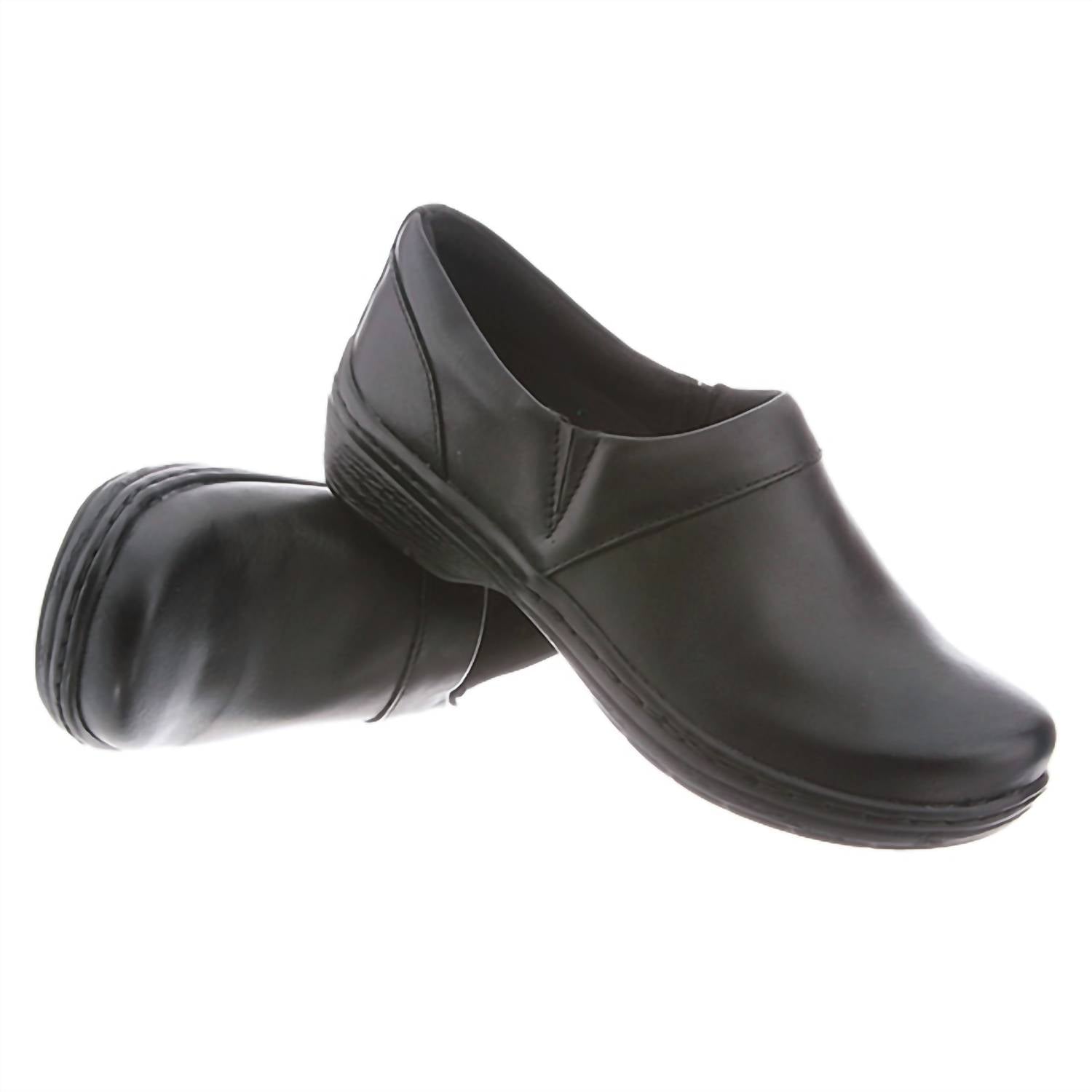Step into style and comfort with the Women's Mission Clog by Klogs Footwear in Black Smooth. Crafted from smooth leather uppers with a closed back and dual-elastic side goring for a secure fit, these clogs boast TRUComfort® Insoles and TRUBase® Outsoles with PURGrip® treads for superior slip and oil-resistance. Designed with a contoured outsole and non-marking properties, they offer practical wear with a heel height of 1 inch. Made in the USA with globally sourced components, these workwear favorites are perfect for any demanding day.