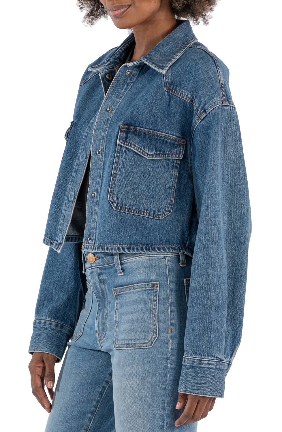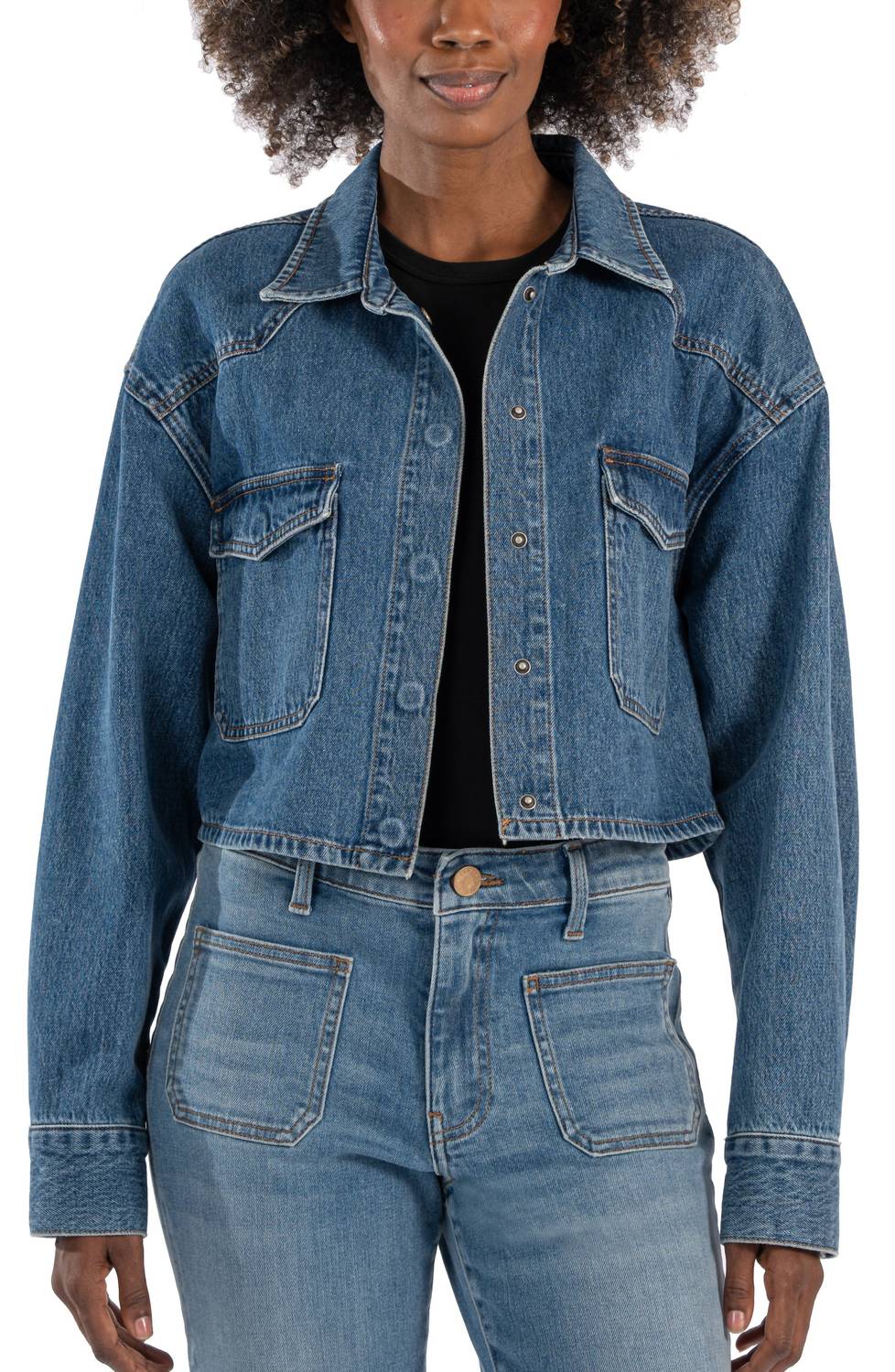 The Billie Crop Denim Jacket by Kut From The Kloth is a versatile wardrobe essential in a solid blue hue. This long sleeve jacket features a classic collar and practical pockets, with a snap closure for ease. Made from 100% cotton, it offers a true-to-size fit and can be styled with various outfits across seasons. Care for this piece is simple with machine wash and tumble dry instructions.
