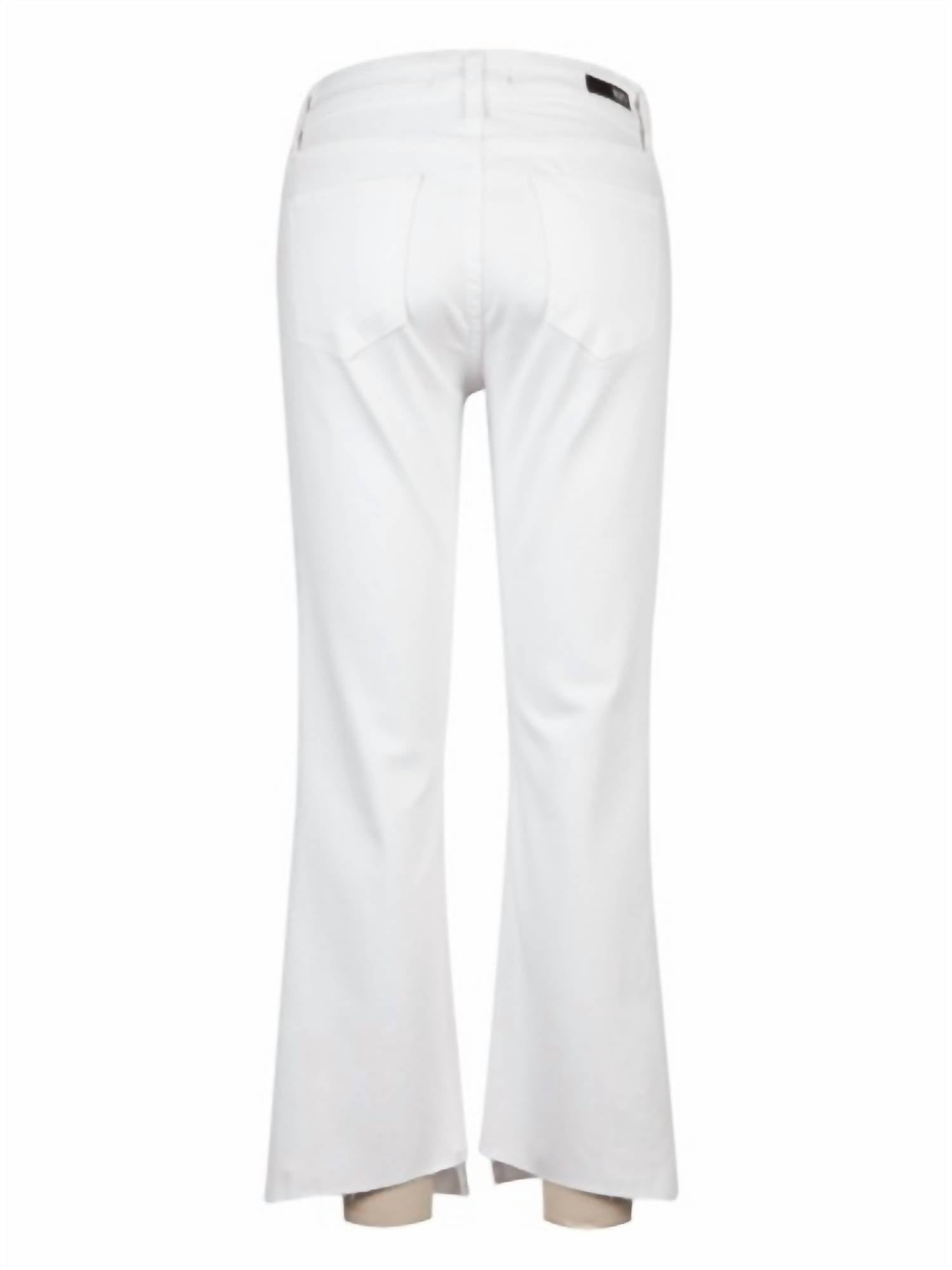 Pair these wide leg jeans with mules, slides or your favorite strappy sandals. Experience the effortless style of the Kelsey High Rise Ankle Flare Step Raw Hem Jeans by KUT FROM THE KLOTH in Optic White. These jeans, crafted from a cotton blend for a comfortable stretch, feature a high rise and a slim, relaxed fit with straight leg style. Composition: 98% Cotton, 2% Spandex. Closure: Zip closure. Care: Machine wash cold, inside out to retain color, and tumble dry low or lay flat to dry.